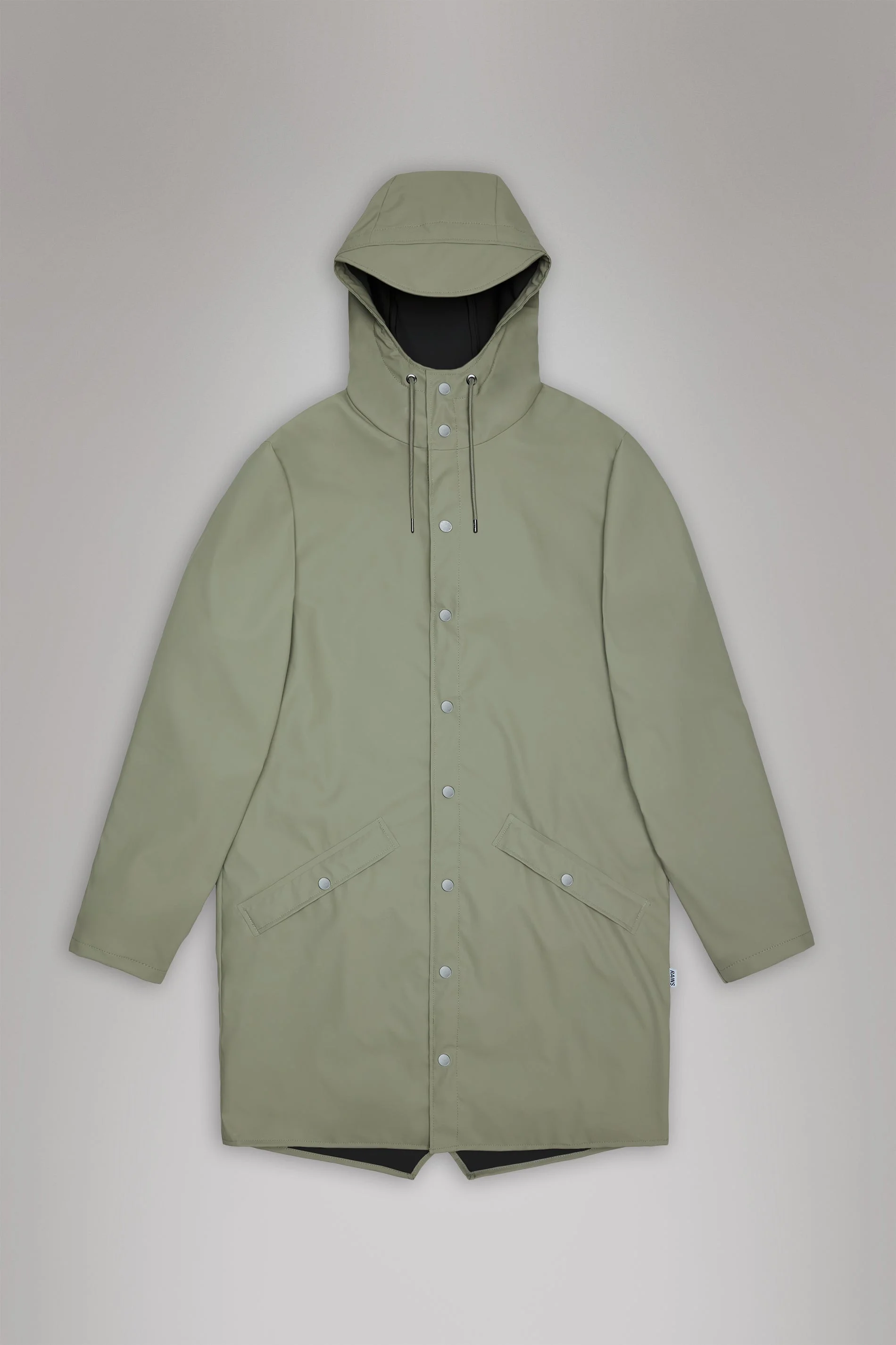Long Jacket is an ever-contemporary unisex rain jacket. Characterized by a minimal silhouette in a long design. This rain jacket is a long version of Rains' classic rain jacket. It features a placket with snap fastenings for closure, hood with built-in cap and two side pockets with snaps. Sleeves are finished with snaps making them adjustable for a loose or tight fit. The design is easy-to-wear with an elegant drape. The unisex rain jacket is completed with under-arm eyelets and a back yoke with concealed vents for breathable comfort. Long Jacket is cut from Rains' signature PU fabric and features welded seams. The finish is lightweight with a smooth feel. SKU: 12020\108 Details Composition: 100.00% PES (Polyester) Water column: 5000 mm Windproof: Protection against windchill Fit: Long Weight: 19 oz Features - Waterproof signature PU fabric - Hood with built-in cap and drawstring - Placket with snap closure - Two side pockets with snaps - Snap adjustment at sleeve cuffs - Vents at arm holes and back yoke - Welded seams - Fishtail hem - Regular fit