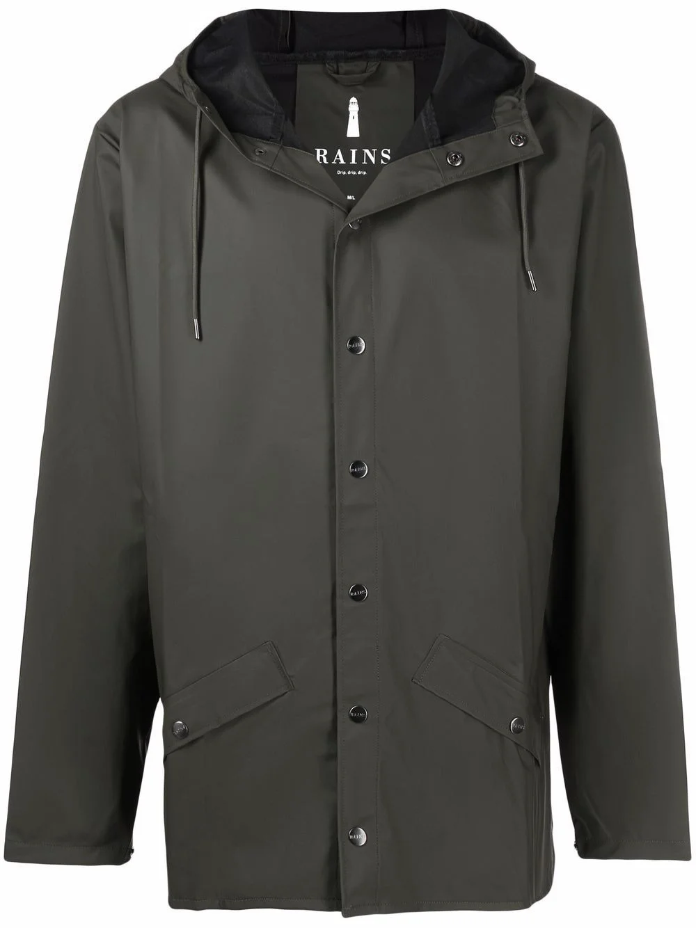long-sleeve hooded rain jacket green drawstring hood front button fastening two front flap pockets long sleeves straight hem Imported Composition Polyester 64%, Polyurethane 36% SIZE & FIT Model measurements Height 5 ft 9 in(1.74 m) Bust/Chest 31.49 in(80 cm) Hips 35.82 in(91 cm) Waist 24.01 in(61 cm) FittingInformation This piece fits true to size. We recommend you get your regular size Cut for a loose fit Made with a mid-weight non-stretch fabric Washing instructions Machine Wash