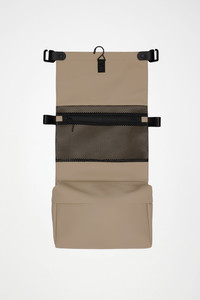 OTG is for life on the go—offering a sleek wash bag solution for ever-changing daily routines. The OTG Wash Bag is built for fast-paced days and overnight stays. The sleek, trifold silhouette opens to reveal organized compartments, making it easy to access grooming essentials whether you're at home or on the move. The design features a main zip compartment, an interior mesh pocket for tools and brushes, and an exterior zip pocket for quick-grab items. Unfold the bag and use the integrated hook to hang it up—ideal for hotel rooms, gym lockers or office restrooms. A flap with c-clips keeps everything secure when folded. OTG Wash Bag is cut from durable PU, with elevated TPU details and minimal hardware for a sharp, modern finish. SKU: 16480\133 Details Dimensions: 7.9 in x 2.4 in x 10.6 in Composition: 100.00% PES (Polyester) Water column: 8000 mm Weight: 13.8 oz Features: