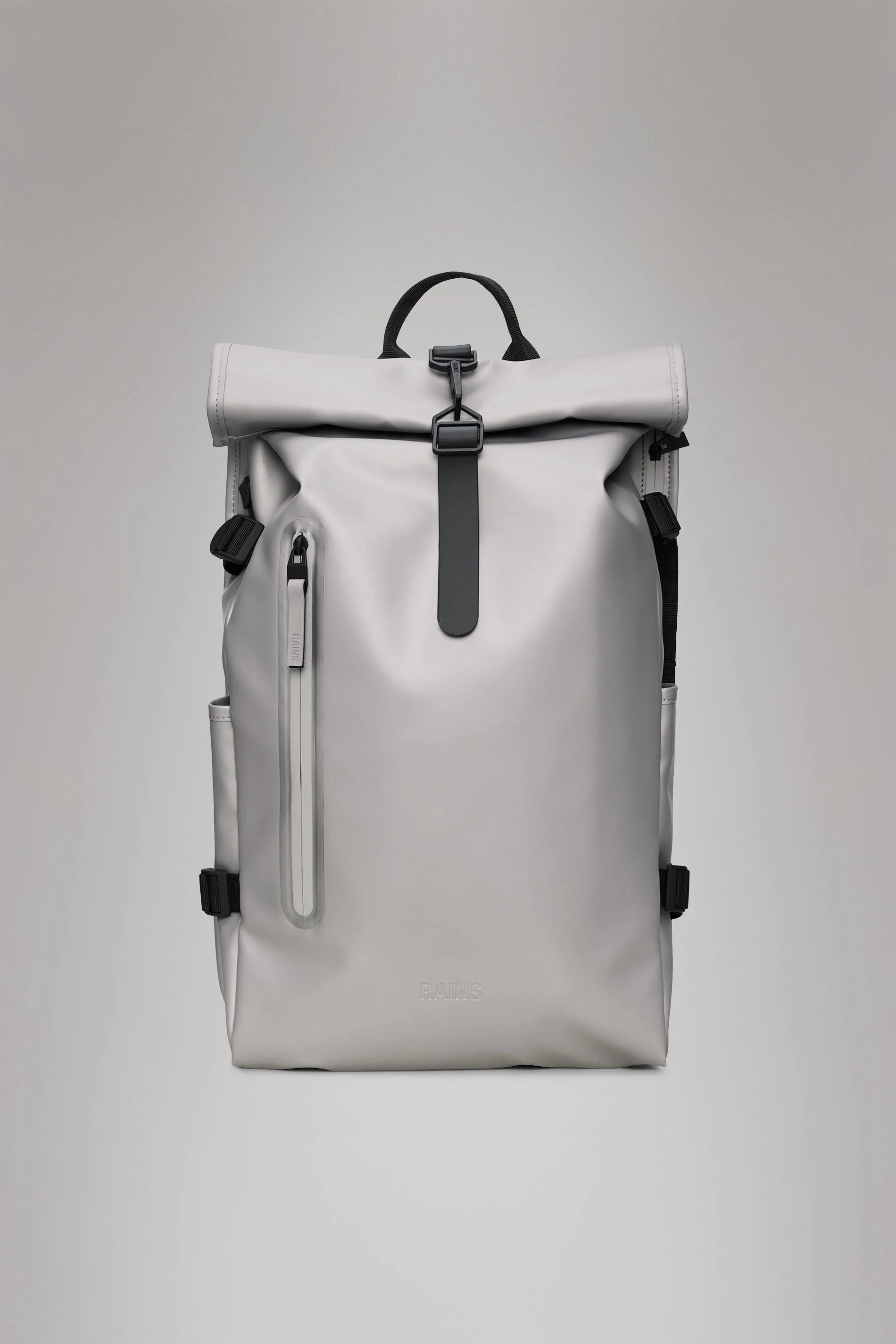 Rolltop Rucksack Large is a dependable city staple. The design interprets Rains' most iconic Rolltop Rucksack with larger proportions and additional functionality. Rolltop Rucksack Large is carefully designed to keep precipitation out when traveling from point A to Z. To protect essentials from rain, fold the rolltop into a tight scroll and secure using the signature carabiner. Open the rucksack to reveal a single main compartment. Exterior features include a side-access laptop pocket, front pocket with coated zipper and two side slip pockets. Cycle-ready features include a front D-ring -- ideal for holding bike locks -- and a buckle-fastened chest strap for a secure ride-proof fit. Rolltop Rucksack Large is cut from Rains' signature waterproof PU fabric, engineered for carrying strength, durability and a smooth feel. SKU: 14590\123 Details Dimensions: 24.8 in x 5.5 in x 12.6 in Capacity: 6.1 gal Composition: 100.00% PES (Polyester) Water column: 8000 mm Weight: 35.3 oz Features - Waterproof signature PU fabric - Rolltop opening with snap compression and carabiner closure - Single main compartment - Front pocket with coated zip - Side-access slip pocket fits 16" laptop - Two side slip pockets - Padded air-mesh back panel - Adjustable compression shoulder straps - Webbing carry handle - Adjustable chest strap