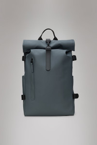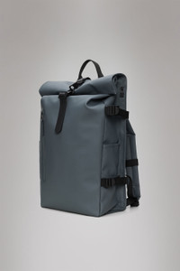 Rolltop Rucksack Large is a dependable city staple. The design interprets Rains' most iconic Rolltop Rucksack with larger proportions and additional functionality. Rolltop Rucksack Large is carefully designed to keep precipitation out when traveling from point A to Z. To protect essentials from rain, fold the rolltop into a tight scroll and secure using the signature carabiner. Open the rucksack to reveal a single main compartment. Exterior features include a side-access laptop pocket, front pocket with coated zipper and two side slip pockets. Cycle-ready features include a front D-ring -- ideal for holding bike locks -- and a buckle-fastened chest strap for a secure ride-proof fit. Rolltop Rucksack Large is cut from Rains' signature waterproof PU fabric, engineered for carrying strength, durability and a smooth feel. SKU: 14590\124 Details Dimensions: 24.8 in x 5.5 in x 12.6 in Capacity: 6.1 gal Composition: 100.00% PES (Polyester) Water column: 8000 mm Weight: 35.3 oz Features - Waterproof signature PU fabric - Rolltop opening with snap compression and carabiner closure - Single main compartment - Front pocket with coated zip - Side-access slip pocket fits 16" laptop - Two side slip pockets - Padded air-mesh back panel - Adjustable compression shoulder straps - Webbing carry handle - Adjustable chest strap