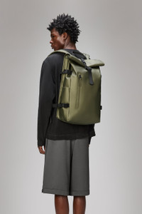 Rolltop Rucksack Large is a dependable city staple. The design interprets Rains' most iconic Rolltop Rucksack with larger proportions and additional functionality. Rolltop Rucksack Large is carefully designed to keep precipitation out when traveling from point A to Z. To protect essentials from rain, fold the rolltop into a tight scroll and secure using the signature carabiner. Open the rucksack to reveal a single main compartment. Exterior features include a side-access laptop pocket, front pocket with coated zipper and two side slip pockets. Cycle-ready features include a front D-ring -- ideal for holding bike locks -- and a buckle-fastened chest strap for a secure ride-proof fit. Rolltop Rucksack Large is cut from Rains' signature waterproof PU fabric, engineered for carrying strength, durability and a smooth feel. SKU: 14590\105 Details Composition: 100.00% PES (Polyester) Water column: 8000 mm Weight: 35.3 oz Features - Waterproof signature PU fabric - Rolltop opening with snap compression and carabiner closure - Single main compartment - Front pocket with coated zip - Side-access slip pocket fits 16" laptop - Two side slip pockets - Padded air-mesh back panel - Adjustable compression shoulder straps - Webbing carry handle - Adjustable chest strap