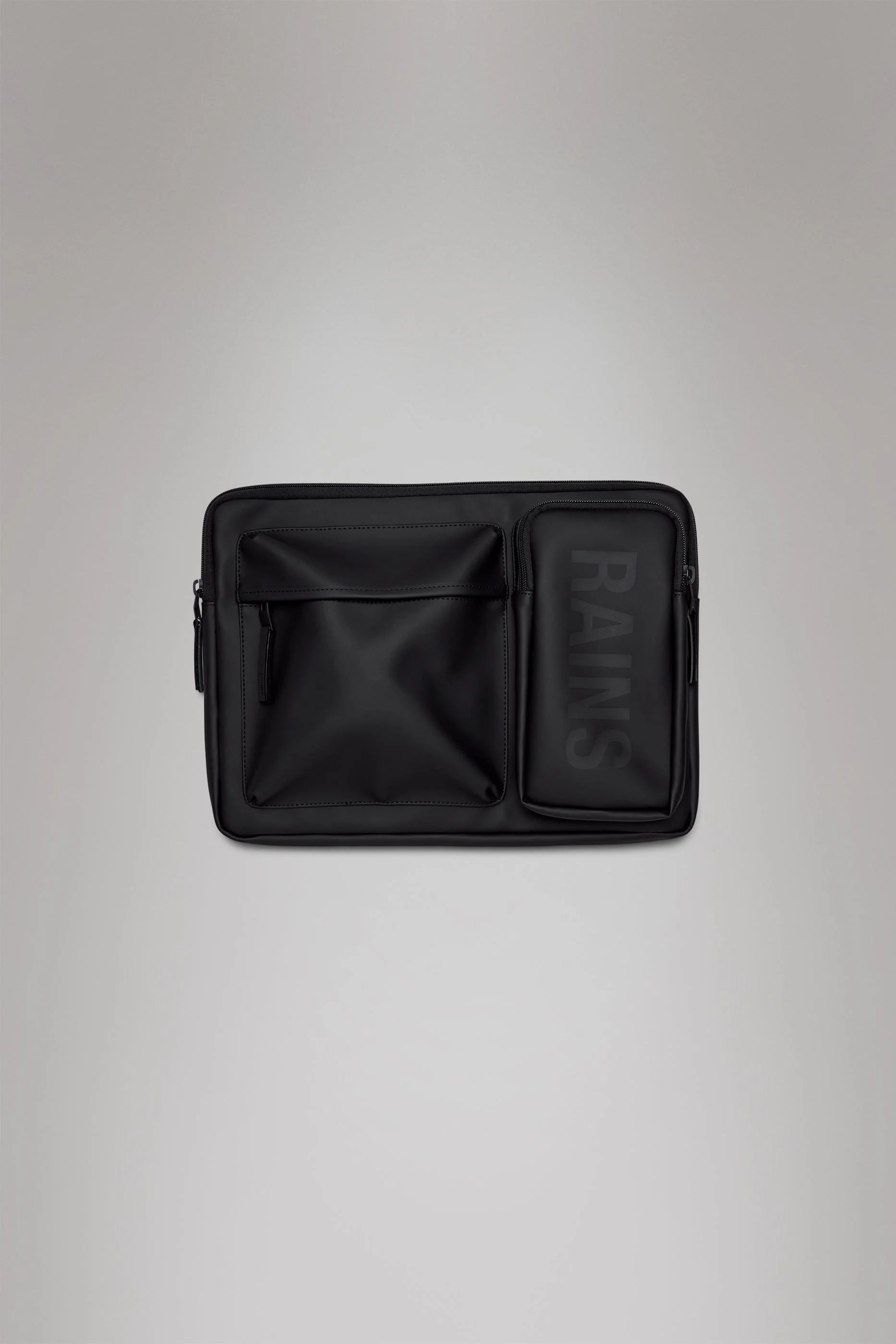 Texel 16" Laptop Case is a spacious waterproof cover with compartments for full-size tech and essentials. Texel Laptop Case is sized to fit 16" laptops. The sturdy cover is made from waterproof PU and padded for protection against inevitable knocks and bumps. The inside main compartment is fitted with a plush microfiber lining so tech slides seamlessly in and out. Texel Laptop Case is designed for a busy modern professional or student always on-the-move. Two external compartments come in useful for storing notebooks, airpods, charging cables, or memory drives. It's printed with a rubberized logo, just like other styles from the collection. Texel Laptop Case 16" is cut from Rains’ signature waterproof PU fabric, engineered for carrying strength, durability, and a smooth feel. SKU: 16670\01 Details Volume (liter): 0.7 gal Composition: 100.00% PES (Polyester) Water column: 8000 mm Weight: 20.8 oz Features - Waterproof signature PU fabric - Coated tonal zip closure - External slip pocket with coated zip - Single main compartment fits 16" laptops - Two external pockets - Rubberized print logo