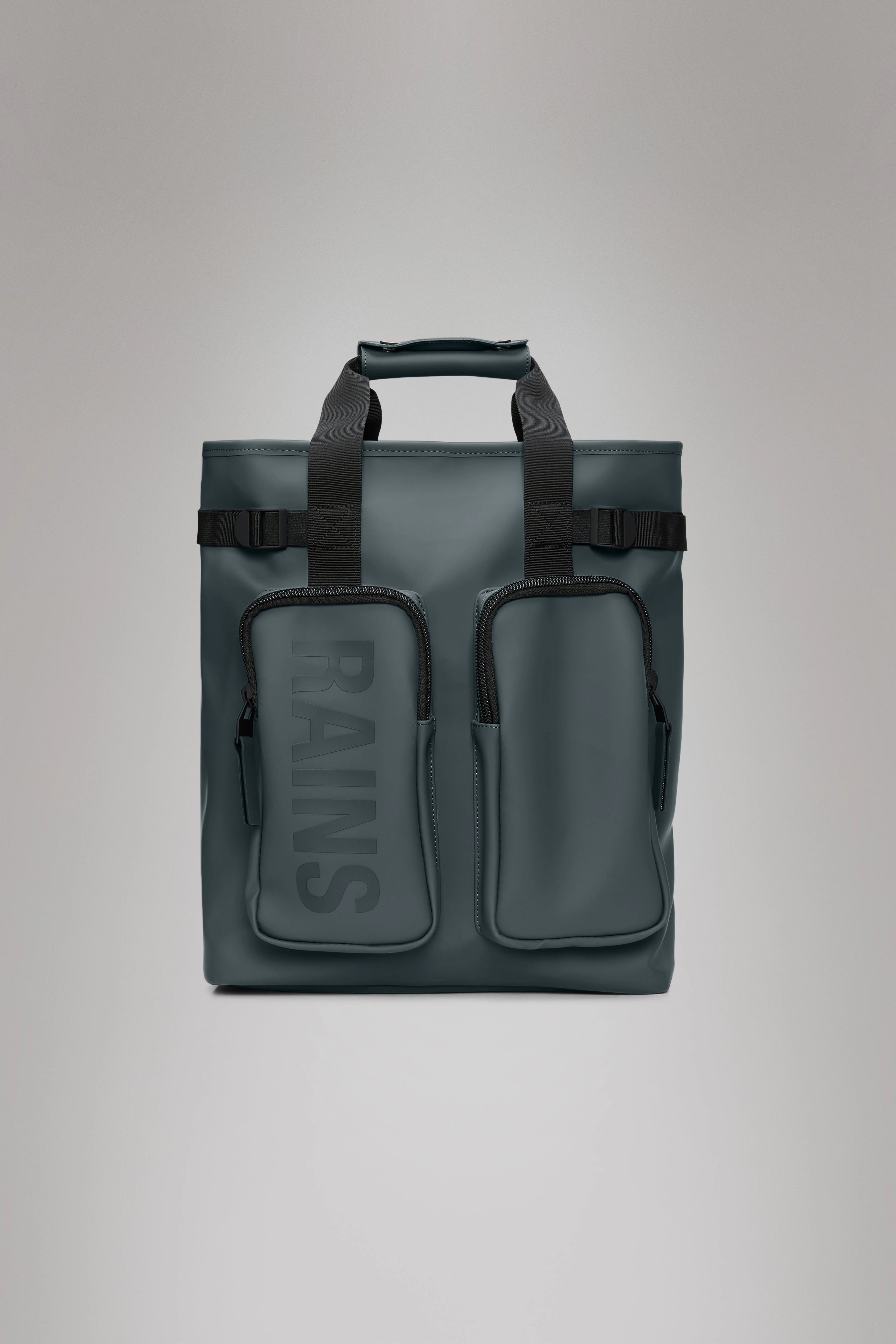 Texel Tote Backpack is a hybrid utility bag with a padded laptop sleeve designed for short travels. It is cut from waterproof PU fabric, designed to repel rain. Texel Tote Backpack doubles as a waterproof tote and backpack, worn via adjustable padded shoulder straps. Unzip the bag to reveal a spacious main compartment with mesh and zip pockets and a padded laptop sleeve for 15” laptops. On the outside, two front utility pockets are ideal for passports, chargers, and other small items. The design is finished with webbing carry handles and side compression straps. A back-mounted trolley sleeve, with zip pocket, allows the bag to be slid onto telescopic trolley handles for easy transportation.* Design is finished off with a padded mesh back panel for comfort. Texel Tote Backpack is cut from Rains’ signature waterproof PU fabric, engineered for carrying strength, durability, and a smooth feel. *Sized to fit Texel Cabin Trolley and Texel Cabin Bag. May not fit trolley bags from other manufacturers. SKU: 14240\124 Details Dimensions: 15.7 in x 4.9 in x 12.2 in Composition: 100.00% PES (Polyester) Water column: 8000 mm Weight: 35.3 oz Features - Waterproof signature PU fabric - Zip closure - Padded mesh back panel - Divided main compartment - Padded sleeve fits 15” laptop - Internal mesh pockets and zip pocket - Front zip pockets - Trolley slip with zip pocket - Padded adjustable shoulder straps