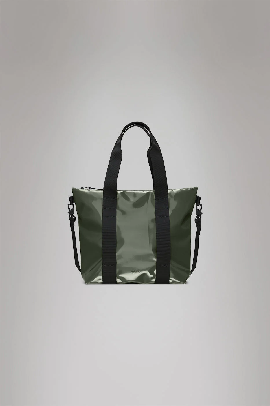 Tote Bag Mini is a waterproof tote perfect for shopping, commutes or the office. Characterized by an elevated utility-look and functional details. The full-length coated zip reveals a spacious main compartment for everyday essentials. Designed to meet your carry-needs, Tote Bag Mini offers various carrying options through its detachable shoulder strap and long hand/shoulder handles. Carry handles feature attachment rings for small items like keys. Tote Bag Mini is cut from Rains' signature PU fabric, engineered for carrying strength, durability and a smooth feel. SKU: 14160\127 Details Dimensions: 14.2 in x 5.1 in x 15.7 in Capacity: 4.2 gal Composition: 100.00% PES (Polyester) Water column: 8000 mm Weight: 21.2 oz Features - Waterproof signature PU fabric - Coated tonal zip closure - Single main compartment - Long hand/shoulder webbing handles with attachment ring - Detachable webbing shoulder strap