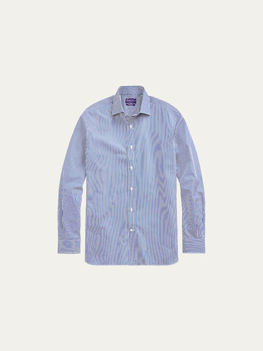Ralph Lauren Purple Label "Aston" dress shirt in sophisticated bengal stripes Expertly crafted with 120s-quality, two-ply cotton cloth Approx. 13.5"L from shoulder to hem Spread collar; button placket Long sleeve; approx. 35.5"L Barrel cuffs Side pleats at back yoke Machine wash cold, line dry Made in Italy Model is 6'1"/185cm. Online Inquiries: BGS21_N6FZX| Store Inquiries: #2707805