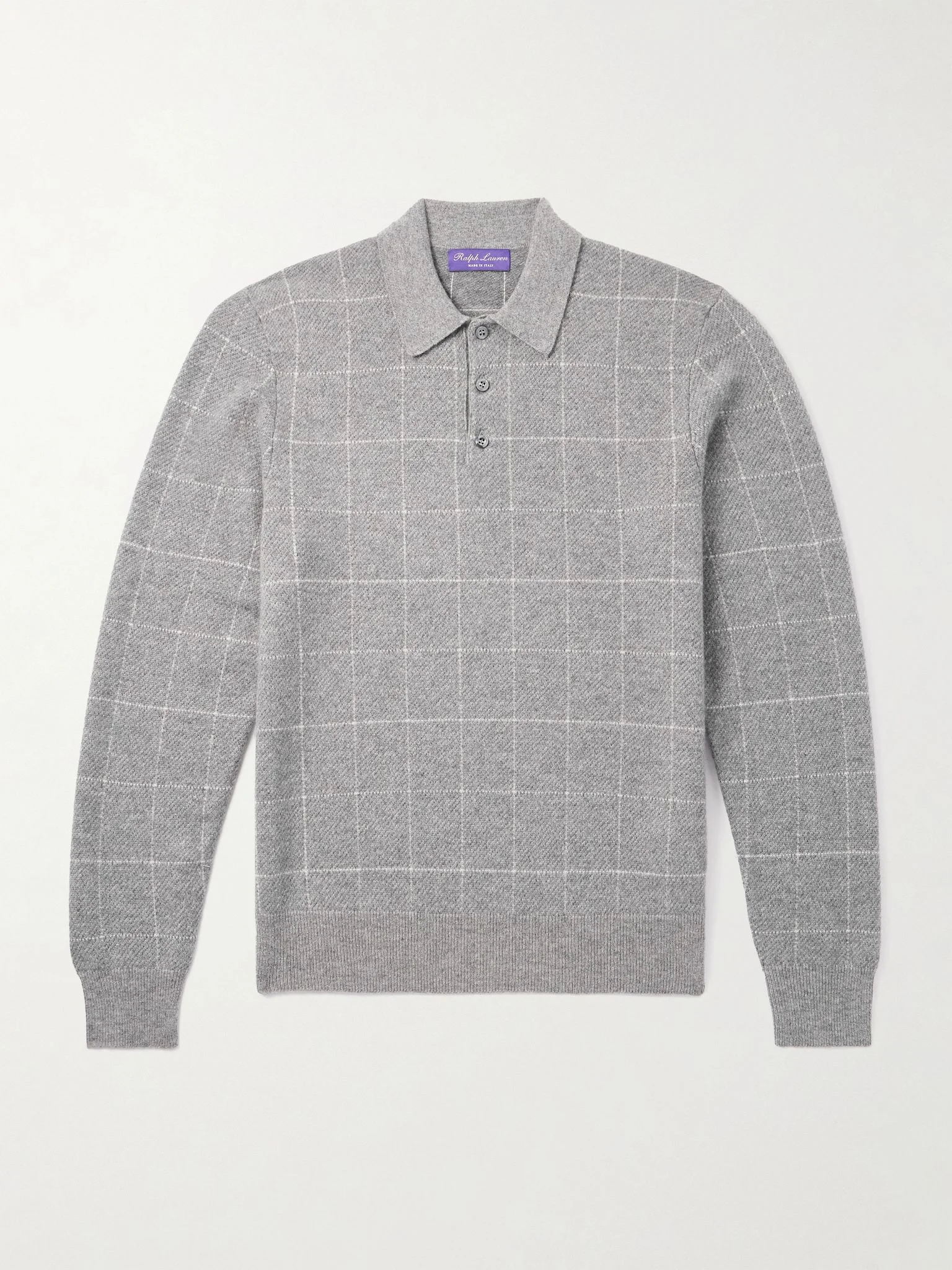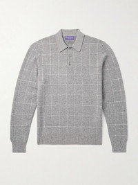 Ralph Lauren Purple Label’s polo shirt is made from plush cashmere, promising exceptional softness. It's patterned with windowpane checks, characterised by slim intersecting lines. Size & Fit - Fits true to size. Take your normal size - Designed for a slightly loose fit - Mid-weight knit - Model is shown wearing a M - Model measures: chest 38"/ 96cm, height 6'2"/ 188cm Details & Care - Grey and white cashmere - Button fastenings - 100% cashmere - Dry clean