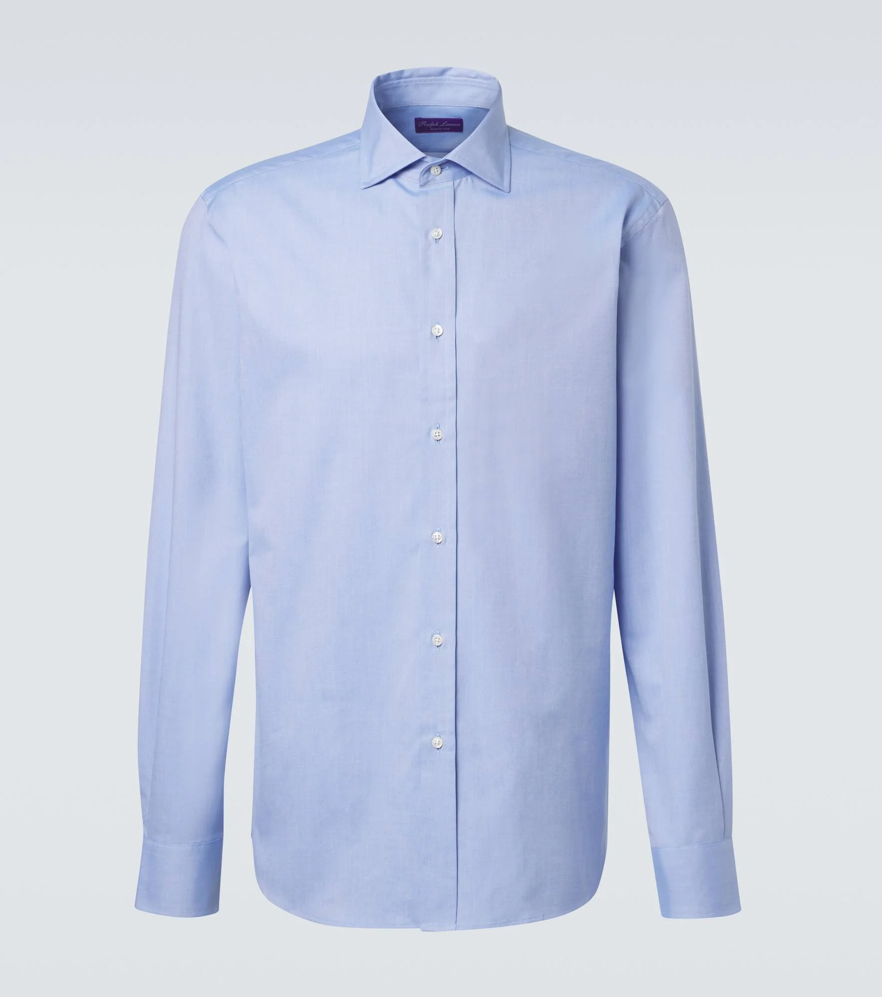 Crafted from luxurious materials, Ralph Lauren Purple Label’s elegant designs boast classic silhouettes and traditional tailoring. This cotton poplin shirt elegantly completes the look with its streamlined cut and classic collar. Product Details - Material: 100% cotton - Care instructions: dry clean - Made in Italy - Color: blue - Designer color name: Light Blue - Contains non-textile parts of animal origin - Collar: classic (Straight point) - Closure: buttoned front - Cuff: one button - Item number: P01083347 Size & Fit - True to size - With pleats in the back - Classic fit - Non-stretchy fabric - Falls below the hip - Height of model is 189cm-74.5" and wears a size L