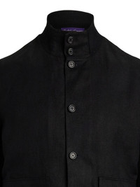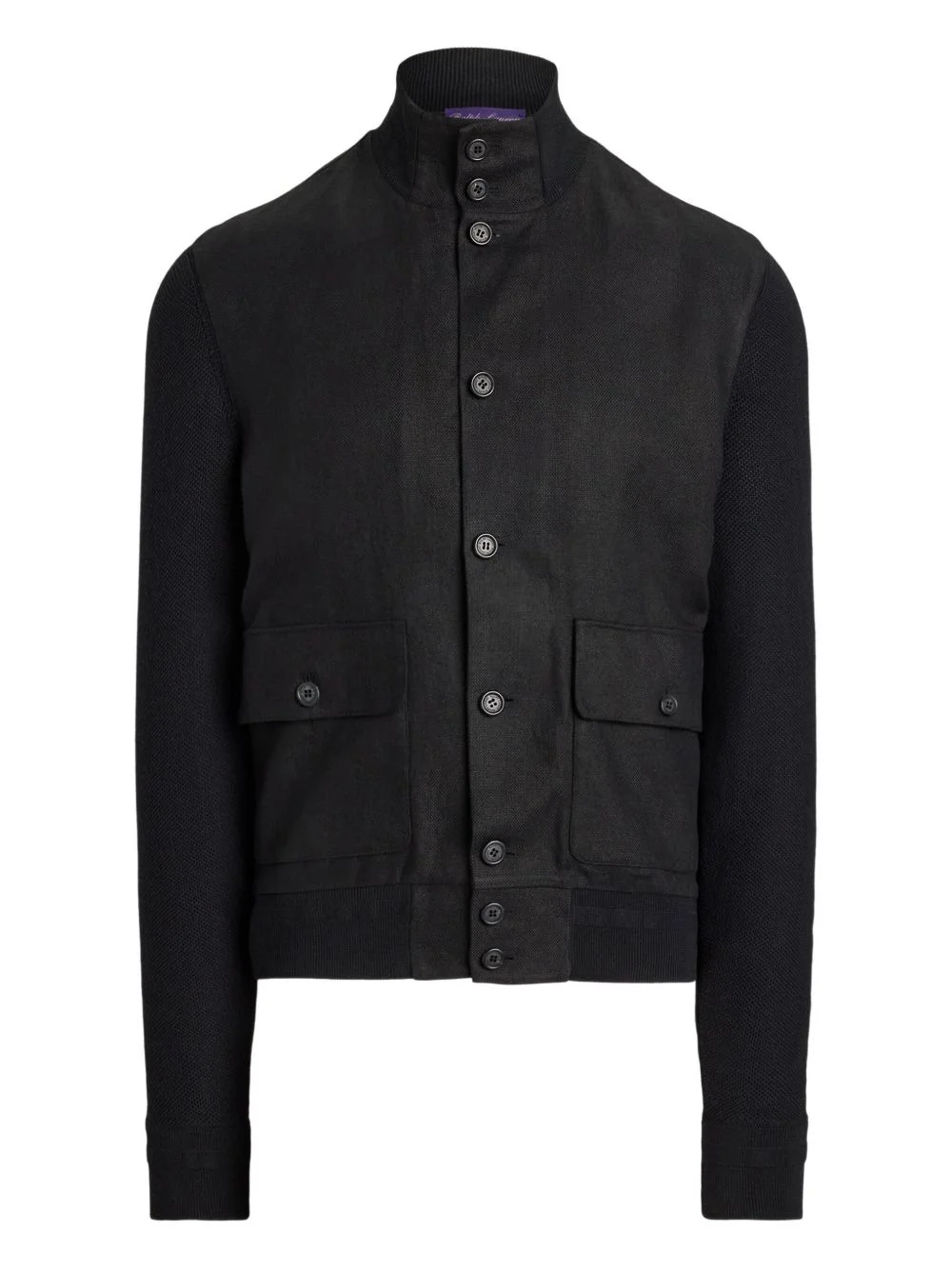 knitted-panel button-front jacket Highlights - Black - High neck - Button fastening - Patch pockets - Knitted panels - Ribbed hem Made in Italy Composition Linen/Flax 67%, Mulberry Silk 17%, Cotton 14%, Nylon 1%, Polyurethane 1% Washing instructions Read Manufacturer Guidelines