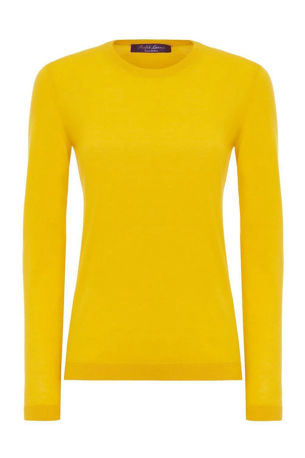 DETAILS AND INSIGHT Ralph Lauren long sleeve crewneck sweater in icon navy/cream/racing yellow. Body: 100% Cashmere Dry Clean Made In Italy Style 290905260043-31BV