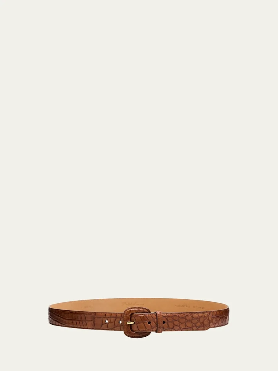 This Ralph Lauren Purple Label belt is expertly crafted in Italy with genuine alligator that is burnished for a rich tone Approx. 1.3"W Leather loop Nubuck leather lining Alligatorcovered buckle Leather Made in Italy