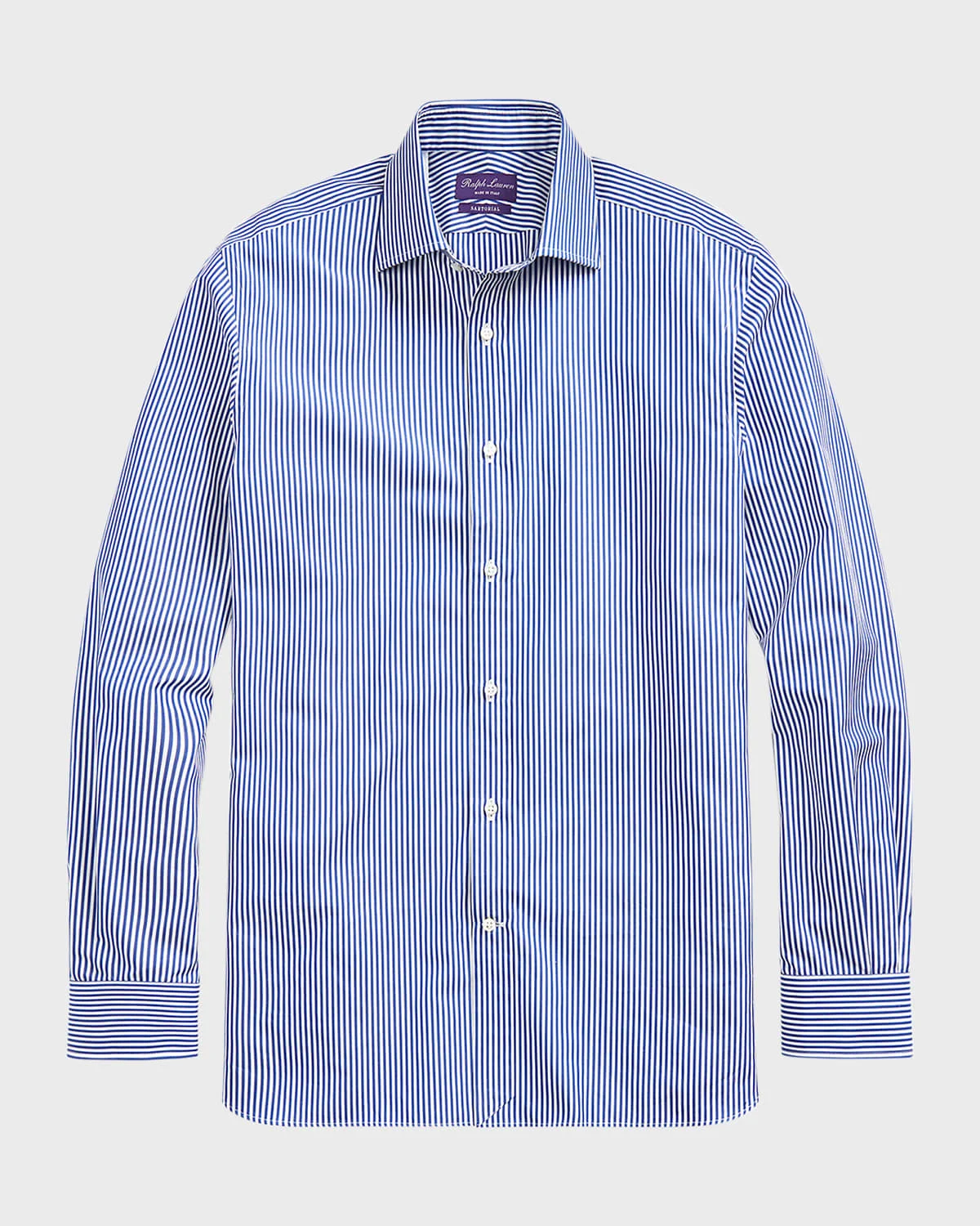 - Ralph Lauren Purple Label "Aston" dress shirt in sophisticated bengal stripes - Expertly crafted with 120s-quality, two-ply cotton cloth - Approx. 13.5"L from shoulder to hem - Spread collar; button placket - Long sleeve; approx. 35.5"L - Barrel cuffs - Side pleats at back yoke - Machine wash cold, line dry - Made in Italy - Model is 6'1"/185cm.