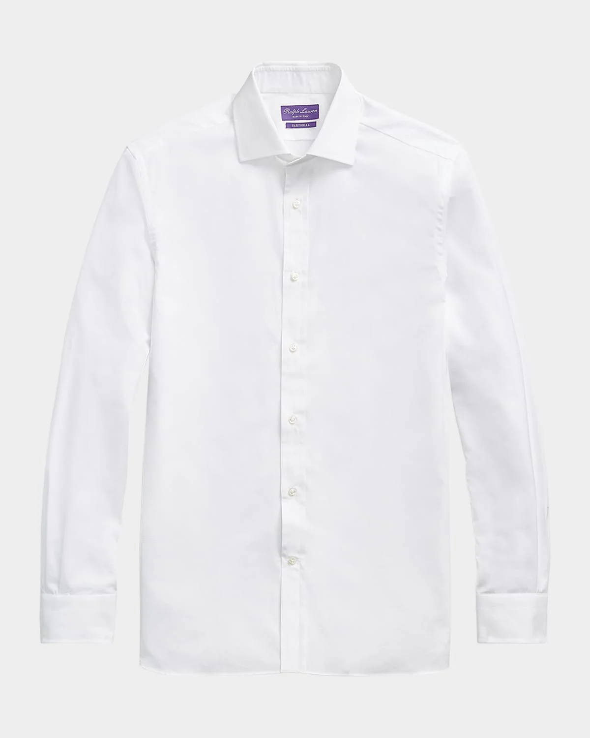 - Ralph Lauren "Aston" sport shirt in solid poplin. - Spread collar; button placket. - Rounded barrel cuffs. - Yoked back shoulders. - Shirttail hem. - Machine washable. - Yarn-dyed cotton. - Made in Italy.