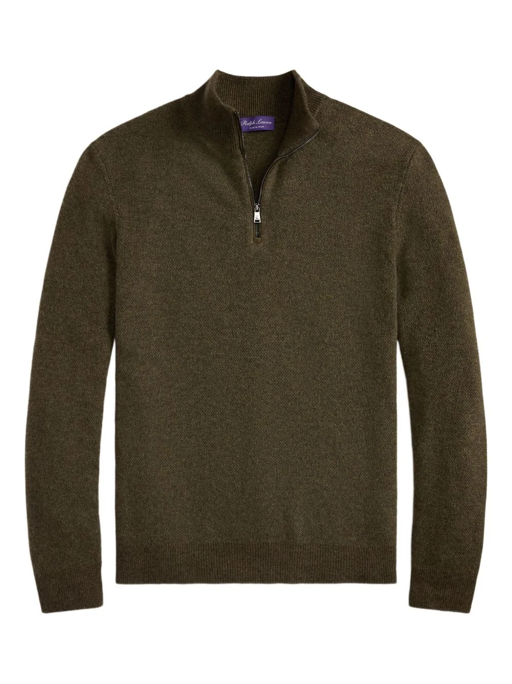 birdseye half-zip pullover Highlights - Olive green - Half-zip fastening - Long sleeves - Birdseye pattern - Ribbed cuffs - Ribbed hem Imported Composition Cashmere 95%, Nylon 3%, Polyurethane 2% Washing instructions Read Manufacturer Guidelines