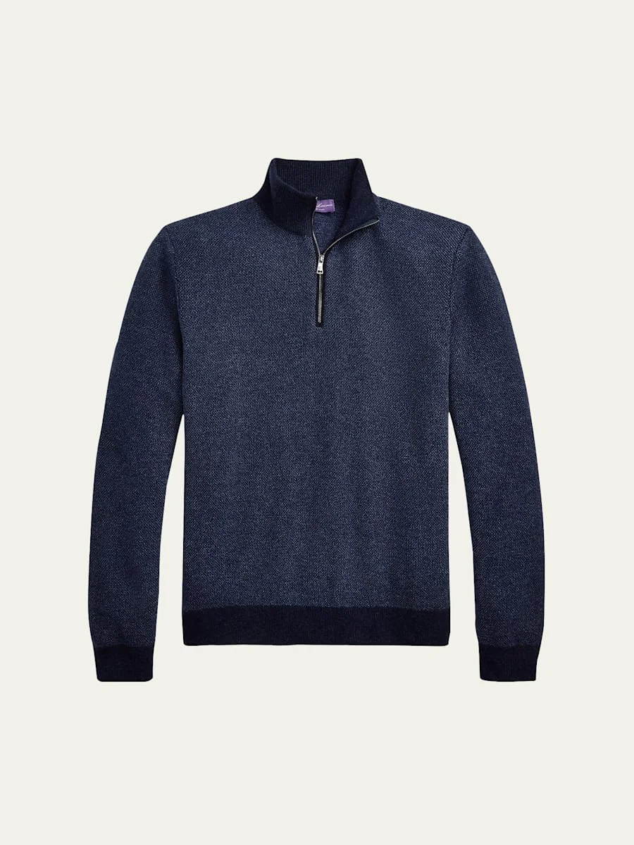 Ralph Lauren Purple Label sweater in ultra-soft cashmere accented with suede trim Ribbed mock neck Half-zip neckline Long sleeves Ribbed cuffs and hem Pullover style Cashmere/suede Made in Italy Online Inquiries: BGS21_NDPS7| Store Inquiries: #5062690