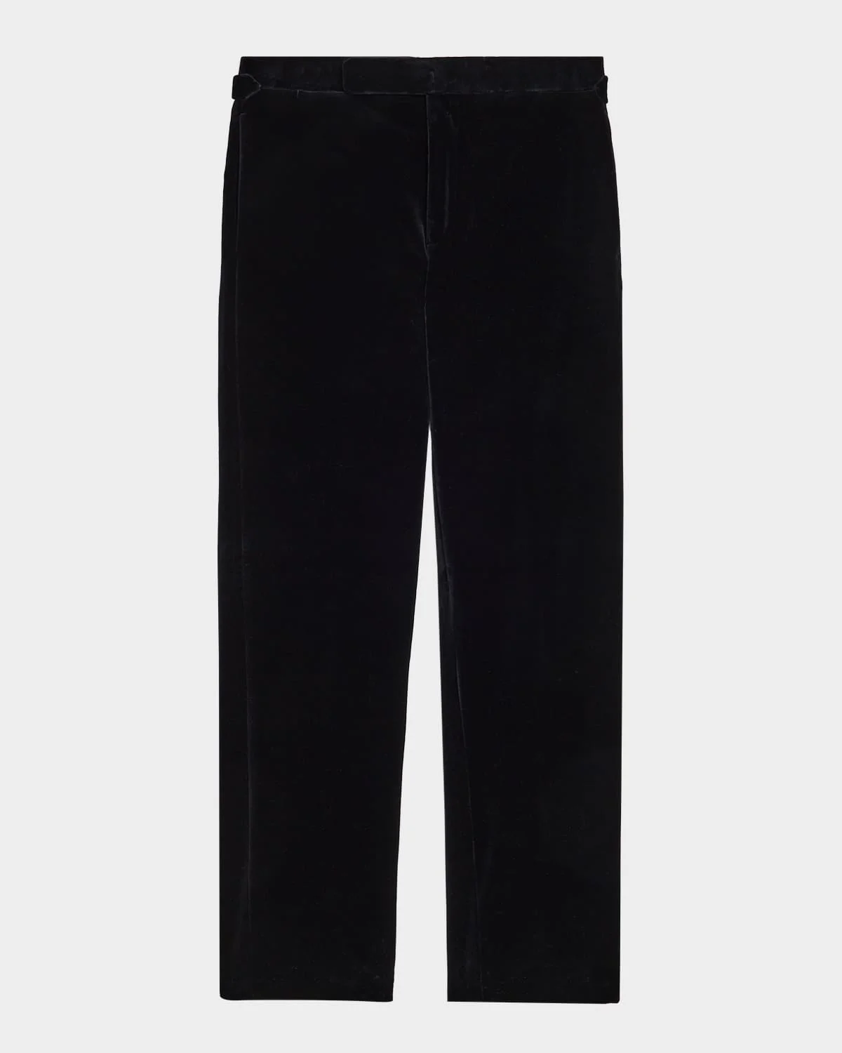 Ralph Lauren "Greg" straightleg trousers crafted from luxurious velvet Approx. 9.25" rise; 38.25" inseam; 15.5" leg opening Regular rise Curtain waistband; side adjusters Side onseam pockets; back buttoned pockets Straight fit Full length Extended hook/zip fly; belt loops Cotton Lining: Viscose Dry clean Made in Italy