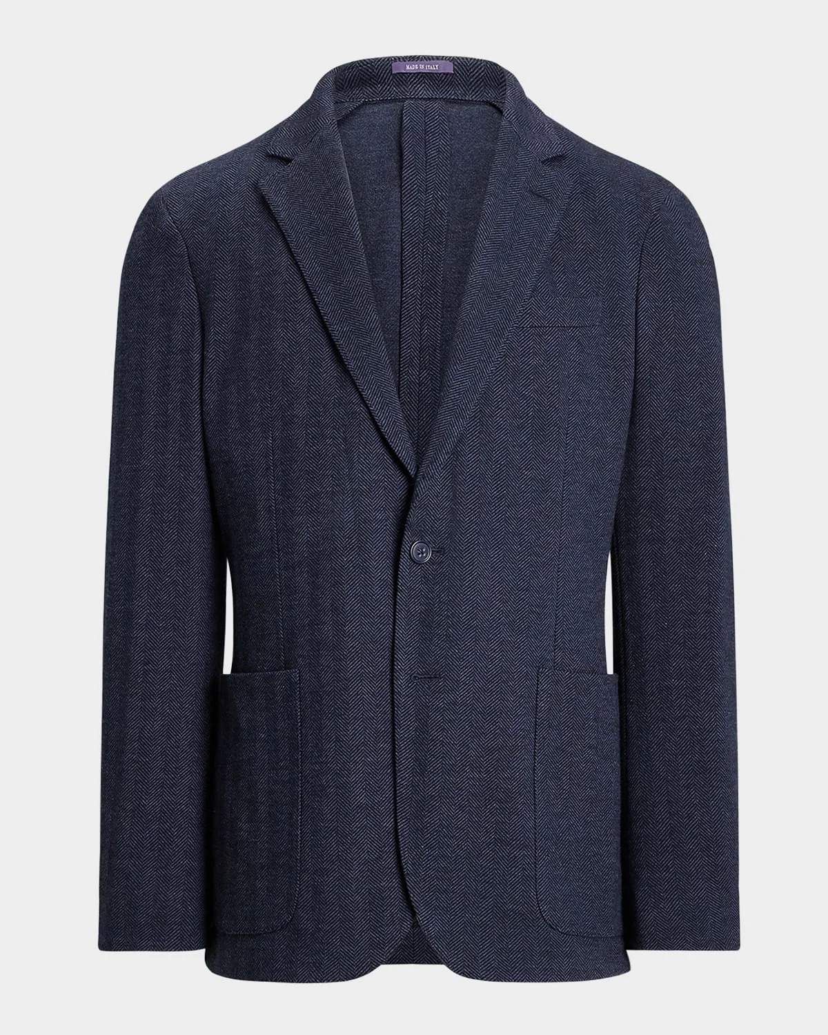 - Hand-tailored in Italy, the Hadley is defined by its soft shoulder and its exceptionally lightweight. This version’s wool-and-cotton jersey reinterprets a traditional Ralph Lauren pattern through a relaxed knit construction. - Ralph Lauren Purple Label "Hadley" sport coat in lightweight wool-cotton - Size 40R has a 30" front body length, a 29.5" back body length, an 18.5" shoulder, and an 18" sleeve inseam. - Soft shoulder; exceptionally lightweight - Relaxed knit construction - Notch lapels - Two-button front - Buttonhole at the left lapel - Left chest welt pocket - Two front waist patch pockets - Two interior chest pockets - Cuffs with four decorative buttons - Lined at the sleeves - Soft shoulders - Double-vented back - Wool/cotton - Lining: Cupro - Dry clean - Made in Italy - Model is 6'1" (185 cm) and wears a size 40R.