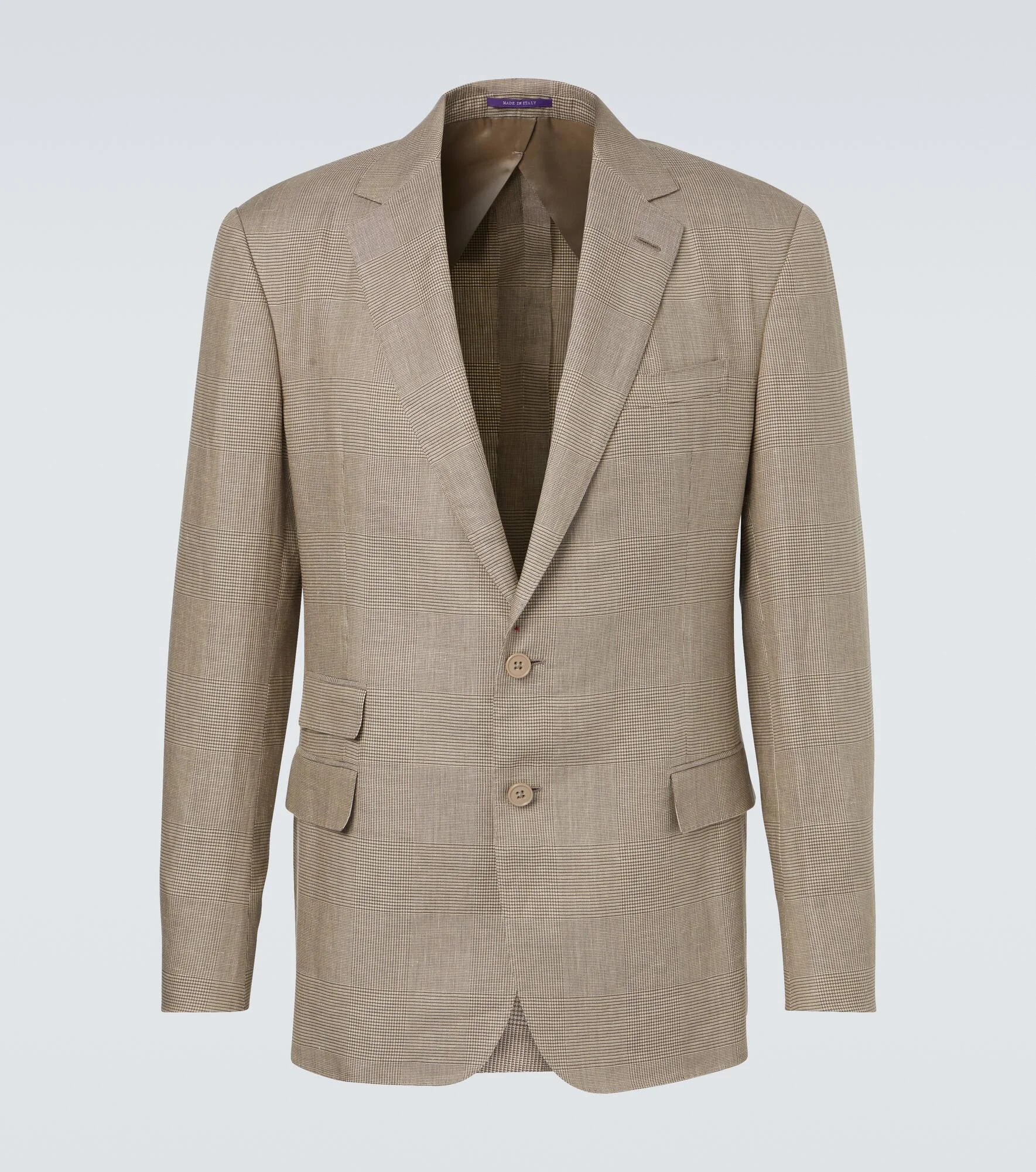 Crafted from luxurious materials, Ralph Lauren Purple Label’s elegant designs boast classic silhouettes and traditional tailoring. Case in point, this single-breasted blazer is cut from a breezy linen and silk blend and finished with a check print. Product Details - Material: 60% linen, 40% silk - Care instructions: dry clean - Made in Italy - Designer color name: Summer Sand/ Truffle - Item color: beige - Material II: 70% wool, 30% viscose - Lining: 100% cupro - Closure: buttoned front - Notched lapel - Pockets: flap pockets - Vent: double - Item number: P01053821 Size & Fit - True to size - Shoulder pad inserts - Slim fit - Non-stretchy fabric - Falls below the hip - The model in the picture is 185cm-6'1" and wearing a size UK 40