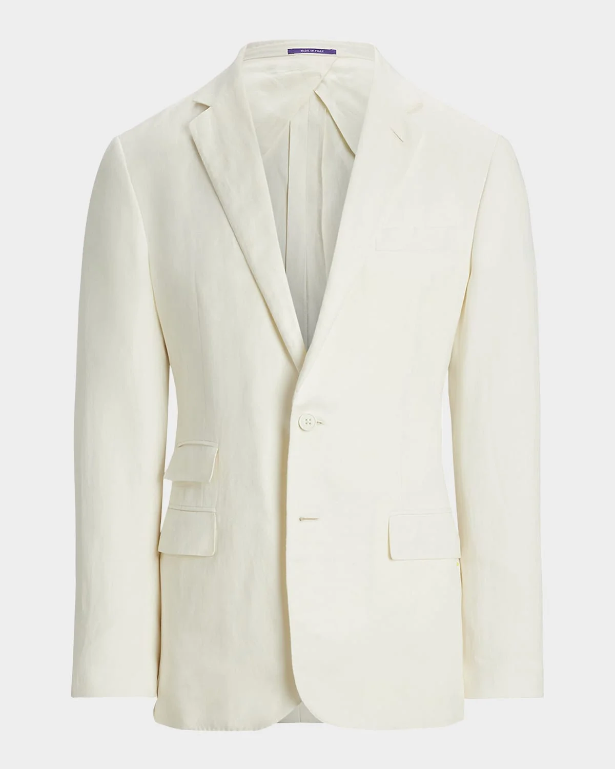 - Hand-tailored in Italy, the Kent combines a lighter construction with fine canvassing and a soft shoulder to create a more natural profile. This version is made with a lightweight canvas cloth that was custom-developed for Ralph Lauren. Woven with textured tussah silk and fine linen, the fabric is washed prior to construction and offers a soft, vintage-inspired effect. - Ralph Lauren Purple Label "Kent" sport coat crafted from a luxurious canvas fabric that is woven with breathable linen and tussah silk - Size 40R has a 30" front body length, a 29.5" back body length, an 18.5" shoulder, and a 17.75" sleeve inseam. - Lighter construction with finer canvassing and a roped shoulder - Notched lapels; buttonhole at the left lapel; genuine mother-of-pearl buttons - Two-button closure - Left chest welt pocket. Ticket pocket. Two front waist flapped pockets. Two interior chest pockets. - Unfinished cuffs ready for custom-tailoring - Double-vented back - Lined at the back yoke and the sleeves - Shell: tussah silk/linen - Undercollar: wool/viscose - Lining: Cupro - Dry clean - Made in Italy - Model is 6'1" (185 cm) and wears a size 40R.