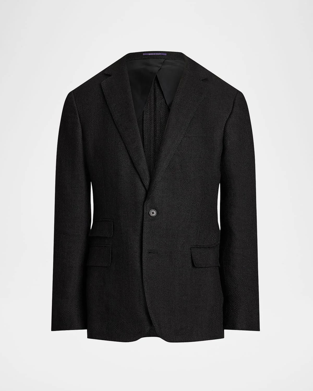 - Ralph Lauren Purple Label sport coat woven in a herringbone linen blend for a dimensional finish - Notched lapels - Single-breasted front - Chest barchetta pocket - Hip flap pockets - Long sleeves - Four-button cuffs - Double-vented back - Linen/silk/cotton - Made in Italy