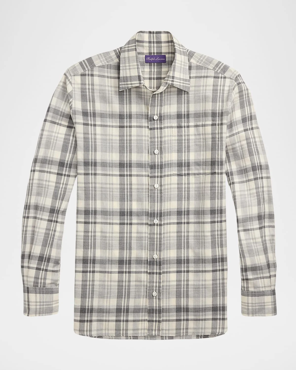 - Ralph Lauren Purple Label plaid shirt exquisitely crafted with Italian cotton twill with a superfine, brushed texture for exceptional comfort and drape - Approx. 30.5"L from shoulder to hem - Straight collar - Button placket - Genuine mother-of-pearl buttons - Left chest patch pocket - Long sleeves; approx. 35"L - Round barrel cuffs - Shirttail hem - Cotton - Unlined - Machine wash - Made in Portugal