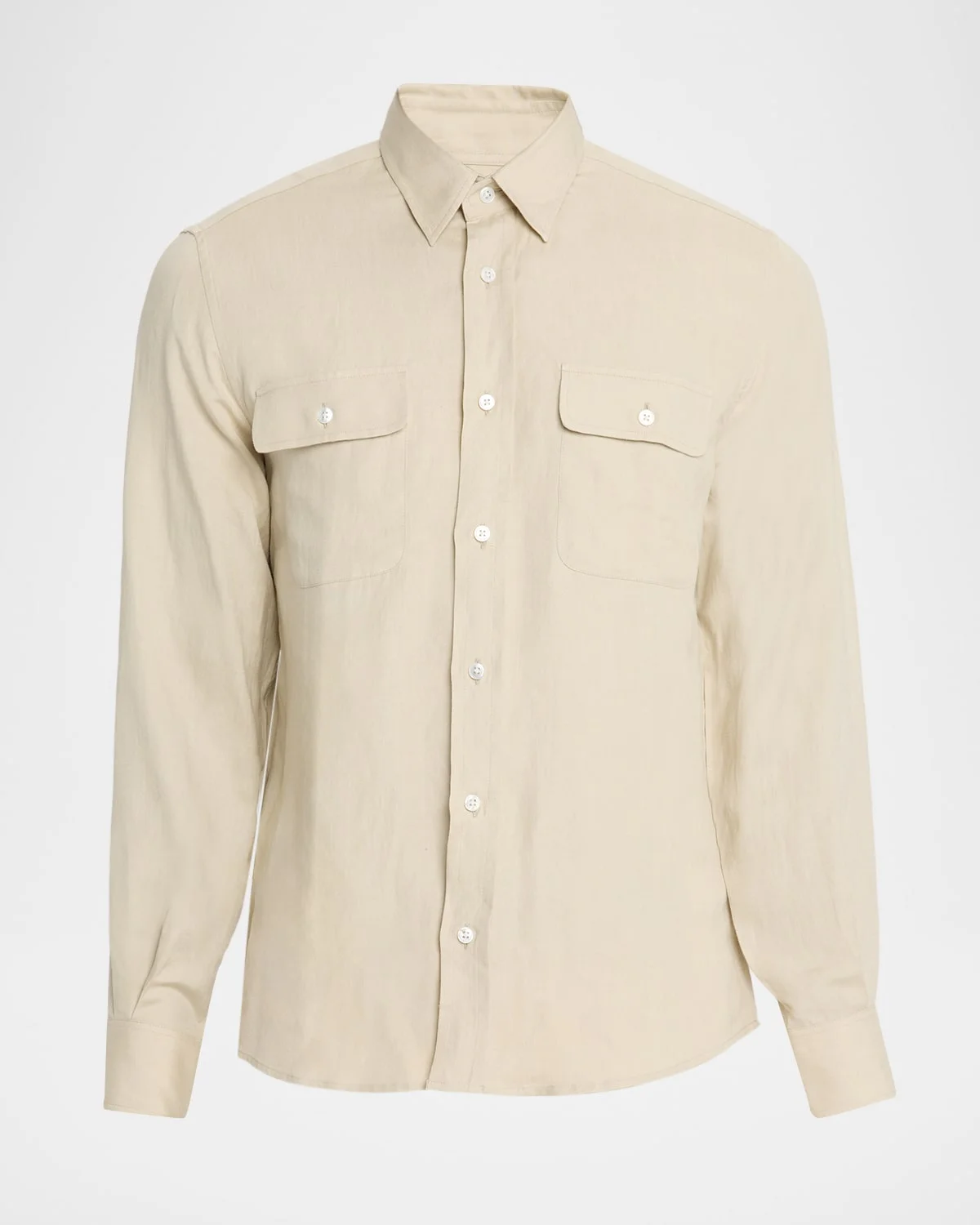 - Ralph Lauren Purple Label button-down shirt in a luxurious blend of tussah silk and lightweight linen to offer a beautiful drape with a silky texture - Approx. 30.5"L from shoulder to hem - Bespoke mother-of-pearl buttons add a signature finishing touch - Point collar - Button placket - Two chest buttoned pockets - Long sleeve; approx. 35"L - Round barrel cuffs - Pleated back yoke ensures smooth, contoured shoulders - Rounded hem - Silk/linen - Unlined - Dry clean - Made in Portugal