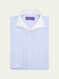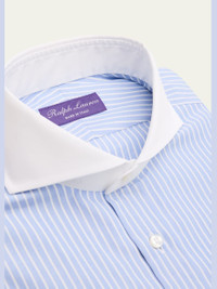The premium cotton of this Ralph Lauren Purple Label dress shirt elevates your style to a higher level with vertical stripes and a solid collar for contrast. Point collar Button placket Long sleeves Round barrel cuffs Cotton Made in Italy Online Inquiries: BGS21_NE2E1| Store Inquiries: #5176347