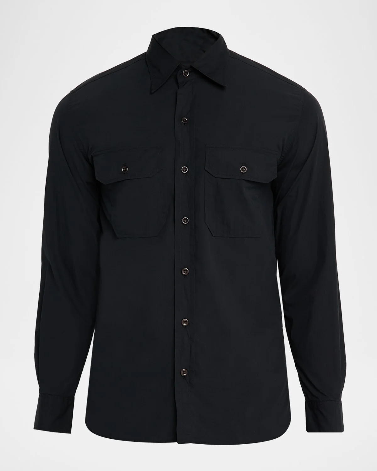 - Ralph Lauren Purple Label button-down shirt in Italian cotton poplin treated with a specially developed finish to provide an incomparably soft, suede-like texture - Approx. 30.5"L from shoulder to hem - Point collar - Two chest buttoned pockets - Button placket - Long sleeve; approx. 35"L - Round barrel cuffs - Curved hem - Cotton - Unlined - Machine wash - Made in Portugal