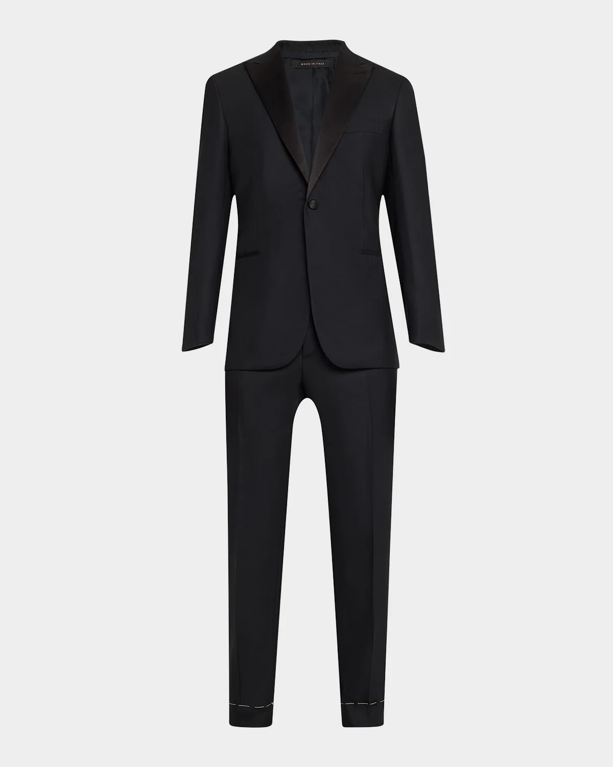 - Ralph Lauren Purple Label tuxedo crafted of luxurious wool barathea - Slim fit - Lining: Cupro/viscose - Dry clean - Made in Italy - Jacket: - Rolled lapels and hand-sewn natural shoulders distinguish the half-canvassed jacket - More structure in the chest and shoulders - Satin peak lapels; buttonhole at the left lapel - One-button silhouette - Left chest welt pocket - Two front waist flapped pockets - Two interior pockets - Fully lined body and sleeves - Cuffs with four decorative buttons - Trousers: - Side adjusters - Curtain waistband - Flat front - Zip fly with extended hook-and-bar closure - Side on-seam pockets - Two back buttoned pockets - Satin stripe down each leg - Unfinished hem to be tailored to desired length - Model is 6'1"/185cm.