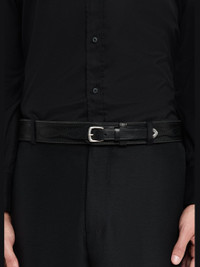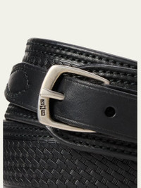 Meticulously crafted of vegetable-tanned leather, this belt by Ralph Lauren Purple Label is distinguished by Western-inspired decorative topstitching and woven detailing. Approx. 1.3"W Silvertone metal prong buckle Leather keeper loop Slightly pointed tip with metal accent Adjustable fit Made in Italy Online Inquiries: BGS21_NEQZ9| Store Inquiries: #5456161