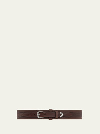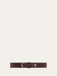 Meticulously crafted of vegetable-tanned leather, this belt by Ralph Lauren Purple Label is distinguished by Western-inspired decorative topstitching and woven detailing. Approx. 1.3"W Silvertone metal prong buckle Leather keeper loop Slightly pointed tip with metal accent Adjustable fit Made in Italy Online Inquiries: BGS21_NER0P| Store Inquiries: #5456755