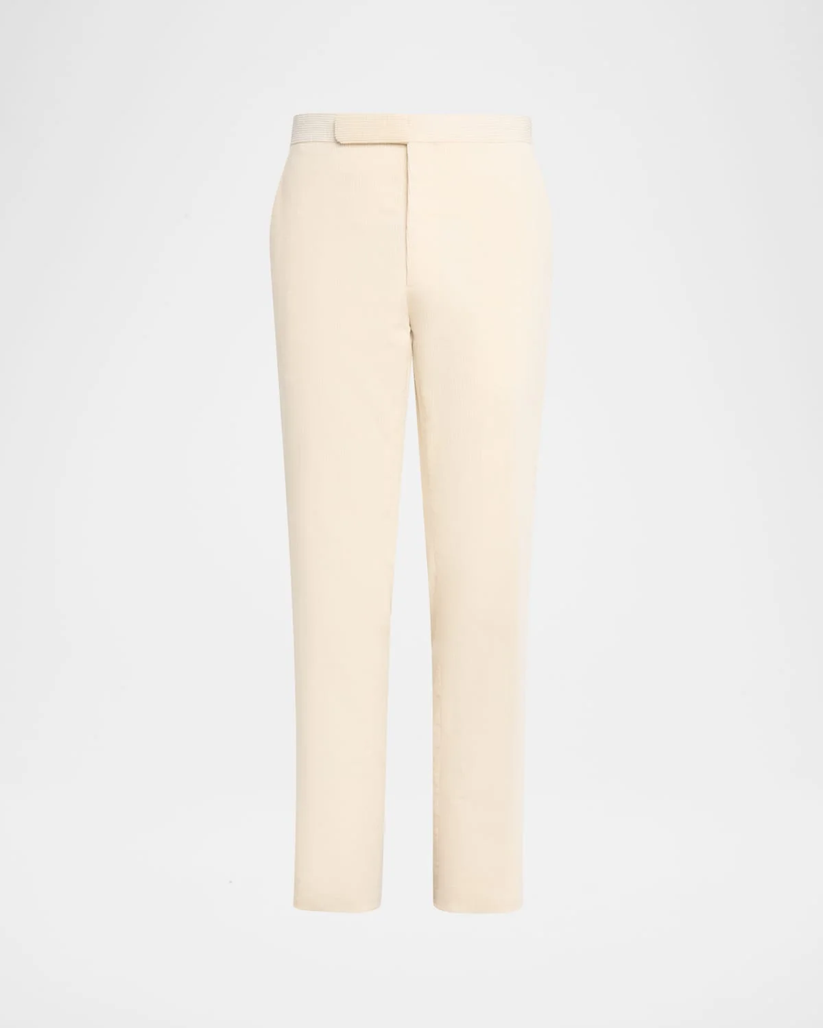 Ralph Lauren Purple Label trousers in soft 9wale cotton corduroy, boasting waistband adjusters for comfortable wear Regular rise Flat front Side slip pockets Buttoned back besom pockets Modern fit through straight legs Full length Extended hookzip front Cotton Made in Italy