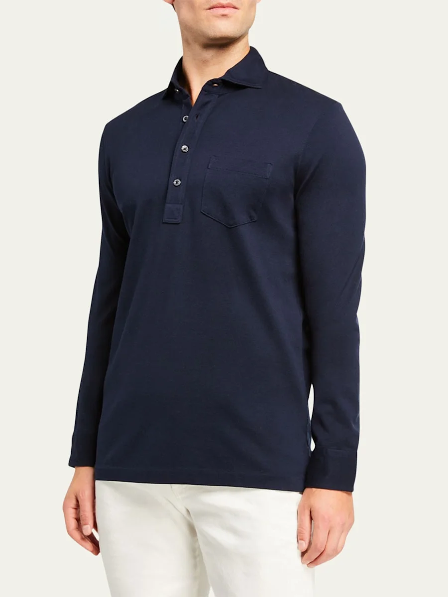 Men's Washed Long-Sleeve Pocket Polo Shirt, Navy