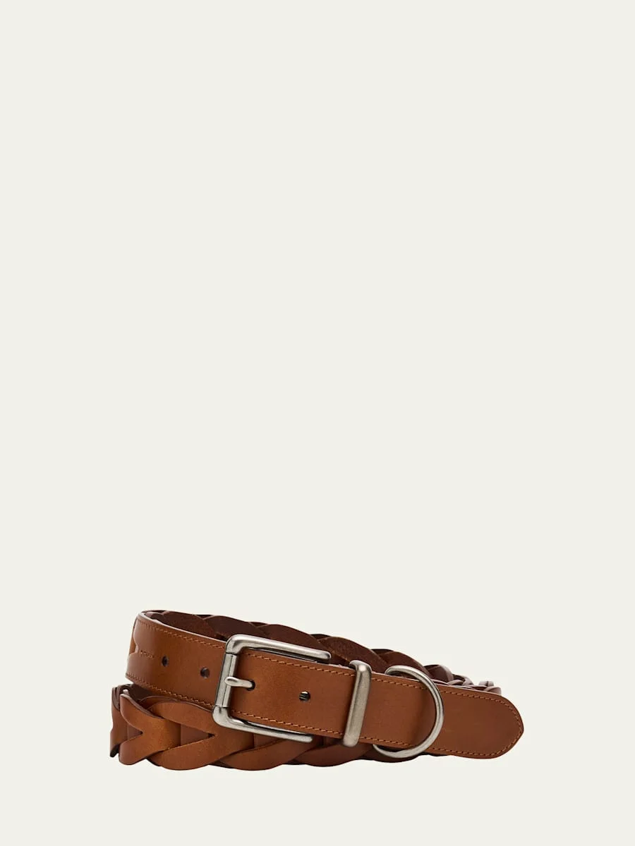 The intricate woven pattern of this vegetable-tanned leather belt by Ralph Lauren Purple Label updates the classic styling of a braided belt while displaying traditional Italian craftsmanship. Approx. 1.3"W Silvertone metal prong buckle Two metal keeper loops Adjustable fit Made in Italy Online Inquiries: BGS21_NER0A| Store Inquiries: #5456557