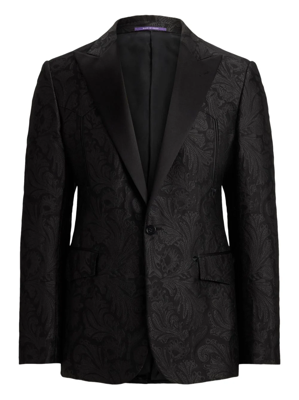 paisley-jacquard single-breasted blazer Highlights - Black - Paisley jacquard pattern - Single-breasted - Peak lapels - Flap pockets Imported Composition Polyester 55%, Cotton 35%, Elastane 10% Washing instructions Read Manufacturer Guidelines