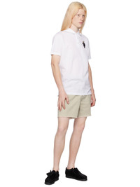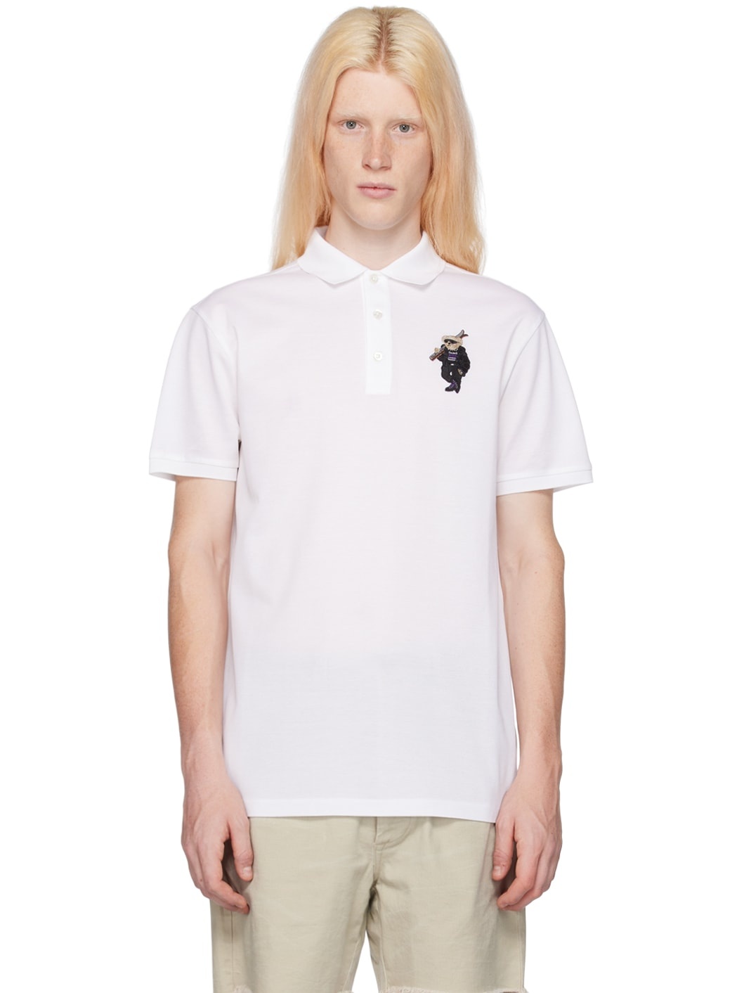 Cotton piqué polo. · Rib knit spread collar and cuffs · Three-button placket · Embroidered graphic patch at chest · Tennis-tail hem · Logo embroidered at cuff Supplier color: Classic white