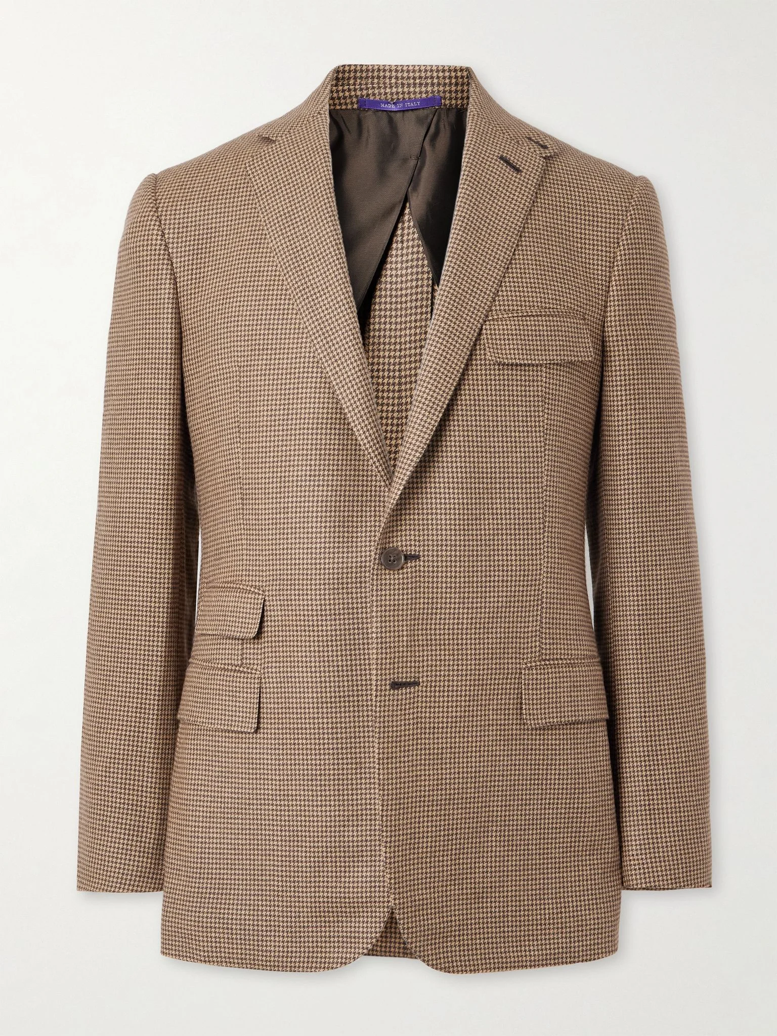 Ralph Lauren says the Purple Label's SS25 collection celebrates "a personal style that is effortless and timeless, a quiet sophistication that is confident and always authentic". This puppytooth blazer has been tailored in Italy from a wool, silk and cashmere-blend and features a throat latch inspired by traditional sport coats. Small to size. See Size & Fit notes. Size & Fit - Fits small to size. Take one size larger than normal - Tailored for a slim fit - Mid-weight, non-stretchy fabric - Model is shown wearing a UK 40 - Model measures: chest 38"/ 96cm, height 6'1"/ 185cm Details & Care - Brown and sand wool, silk and cashmere-blend - Notch lapels, chest flap pocket, three front flap pockets, double vent, two internal pockets, partially lined - Two button fastening - 75% wool, 15% silk, 10% cashmere; lining1: 70% wool, 30% viscose; lining2: 100% cupro - Dry clean