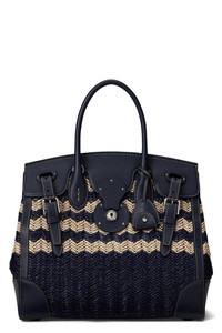 DETAILS AND INSIGHT Ralph Lauren soft ricky 33 raffia bag in navy/natural. The Soft Ricky 33 Offers A Less Structured, Lighter-Weight Take On The Iconic Ricky Bag, With The Same Commitment To Craftsmanship. Meticulously Made In Italy, This Version Is Crafted With A Braided Raffia-Like Body In A Chevron Motif, Lined With Cotton Canvas, Trimmed With Supple Calfskin, Detailed With Polished Hardware, And Finished With Our Signature Lock Debossed With “Ralph Lauren.” Shell: Viscose, Polypropylene, Polyester; Trim: Calfskin; Lining: Cotton; Pocket Lining: Lambskin 10.5" H X 12.25" L X 6.75" D. Made In Italy Style 435977801001_251-2XG2