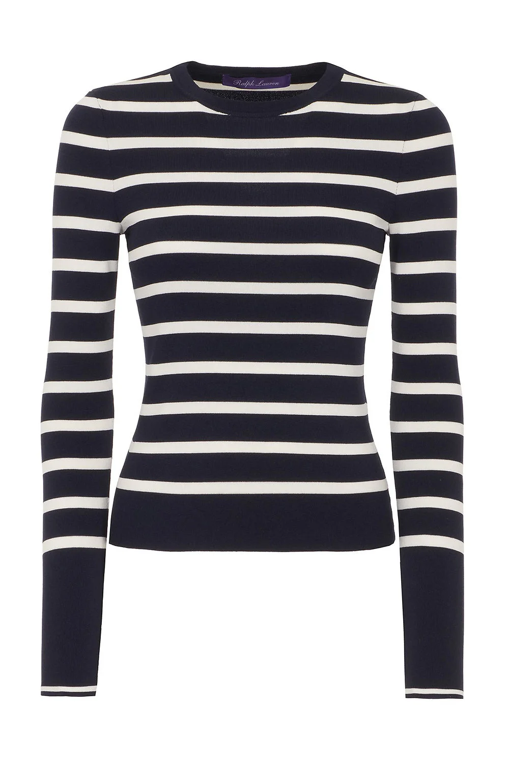 DETAILS AND INSIGHT Ralph Lauren striped crewneck sweater in icon navy/lux cream. Body: 77% Silk (Mulberry) 13% Polyester 7% Polyamide 3% Elastane Dry Clean Made In Italy Style 290P08736001-48R6