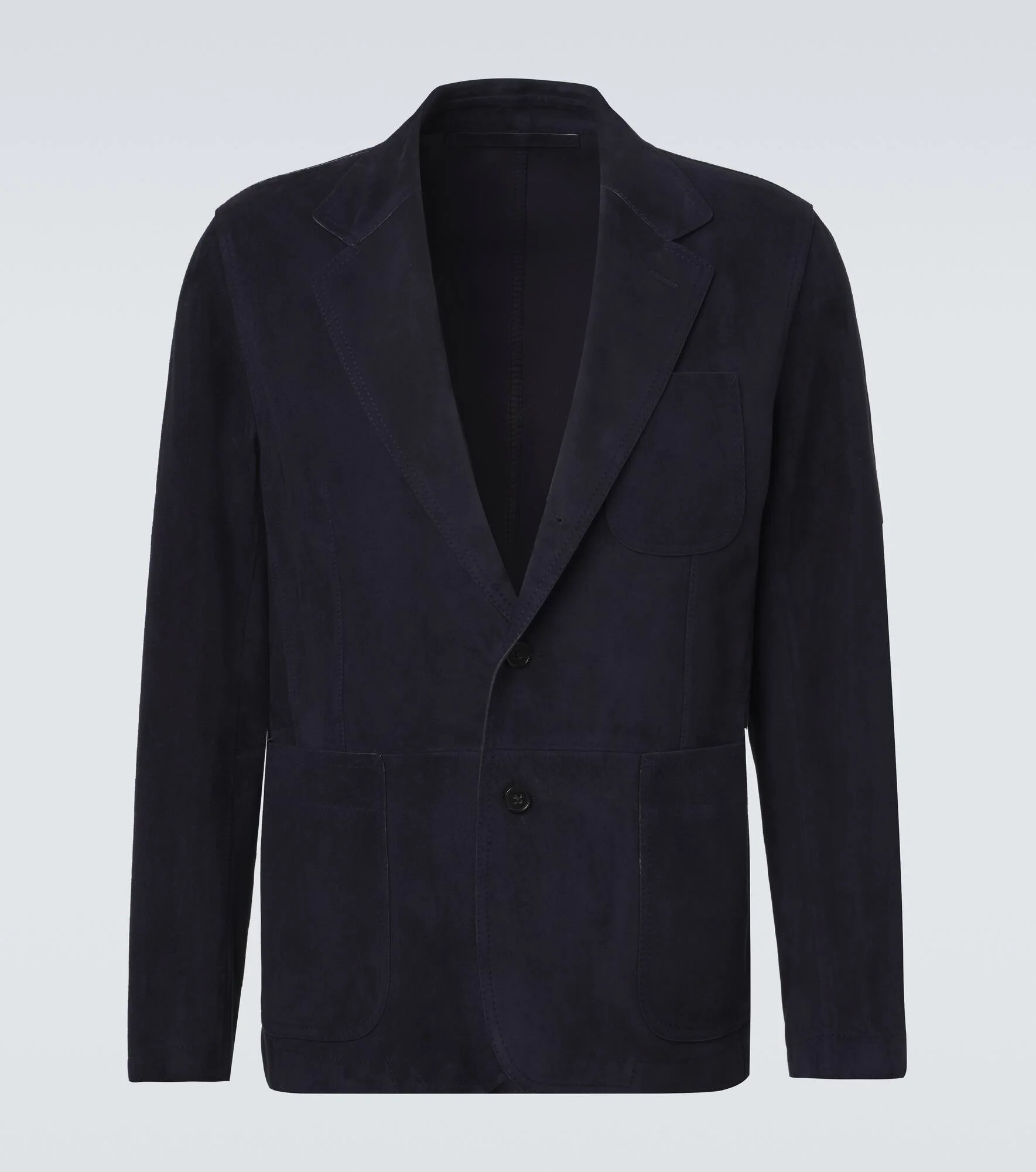 Crafted from luxurious materials, Ralph Lauren Purple Label’s elegant designs boast classic silhouettes and traditional tailoring. This navy single-breasted blazer is crafted from supple suede and finished with tonal stitching. Product Details - Material: 100% lamb leather (suede) - Care instructions: specialist clean - Made in Italy - Color: blue - Designer color name: Navy - Contains non-textile parts of animal origin - Lining: 100% lamb leather - Notched lapel - Pockets: patch pockets, internal pockets - Cuff: three buttons - Vent: single - Item number: P01083352 Size & Fit - Fits small to size - we recommend trying one size larger - Straight fit - Non-stretchy fabric - Falls below the hip - slit length 23cm-9" - Height of model is 192cm-75.5" and wears a size 40