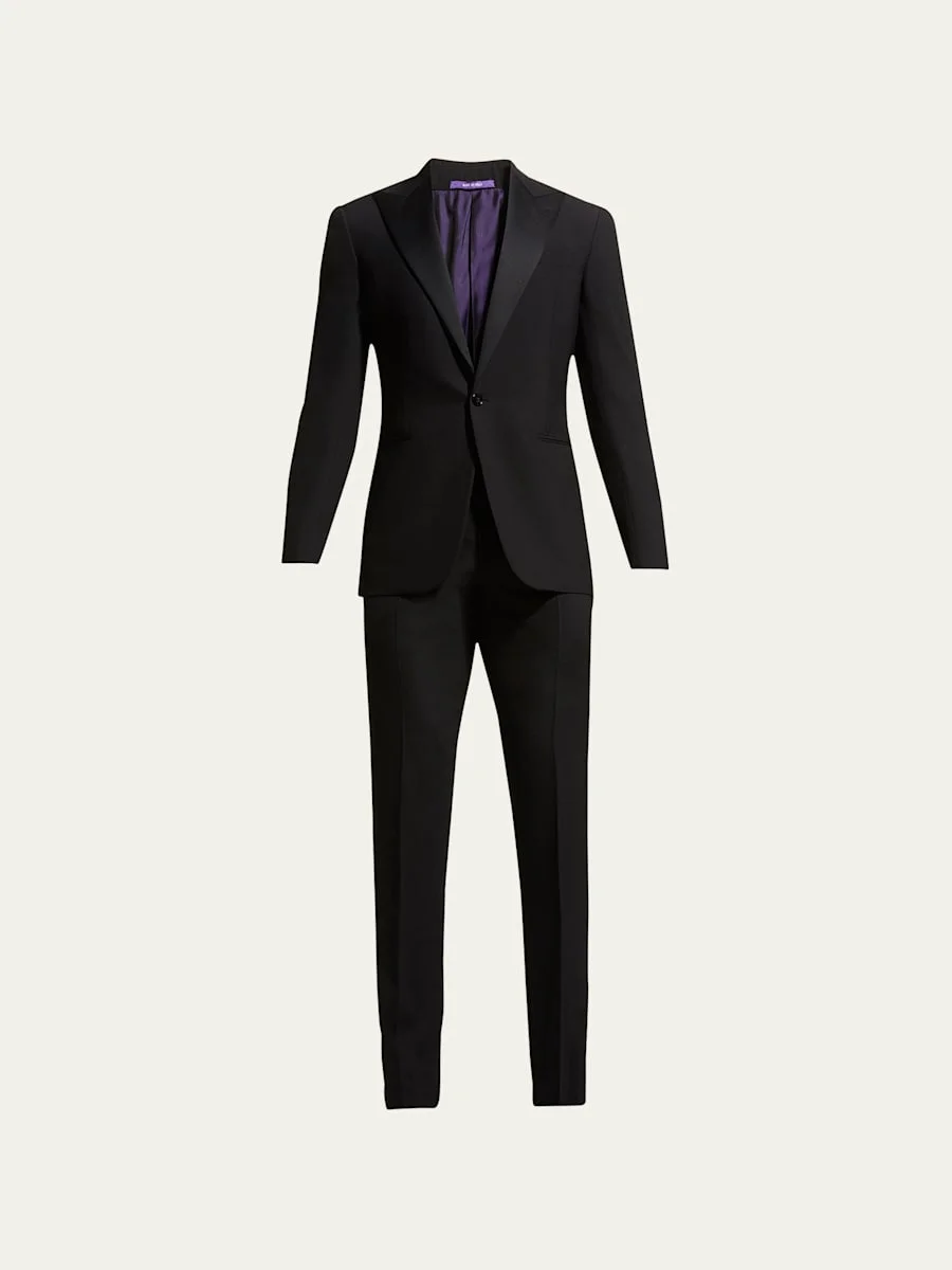 Tom Ford Douglas two-piece formal tuxedo. Approx. measurements: 30" length, from shoulder to hem; rise, 11"; inseam, 35". Peak lapel; one-button front. Basted sleeves. Side welt pockets; chest welt pocket. Flat-front trousers. Side adjusters for perfect fit. Belt loops included. Super 130's Barathea wool. Made in Italy. Model is 6'1"/185cm. Online Inquiries: BGS21_N5THW| Store Inquiries: #2762250