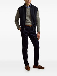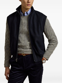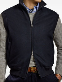 zip-up gilet Highlights - Navy blue - Stand-up collar - Front zip fastening - Ribbed trim - Two side pockets Made in Italy Composition Silk 100%, Sheep Suede 100%, Cashmere 98%, Polyamide 2% Washing instructions Read Manufacturer Guidelines