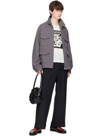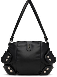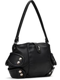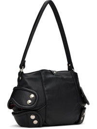 Padded buffed faux-leather messenger bag in black. · Fixed shoulder strap · Logo embossed at face · Studded overlays at sides · Tab-slot closure · Patch pocket at interior · Quilted taffeta lining · H9" x W11" x D3.5" Supplier color: Black Body: 60% polyester, 40% polyurethane. Fill: 94% recycled polyester, 6% polyester. Lining: 100% polyamide. Made in Tunisia 251172M170000