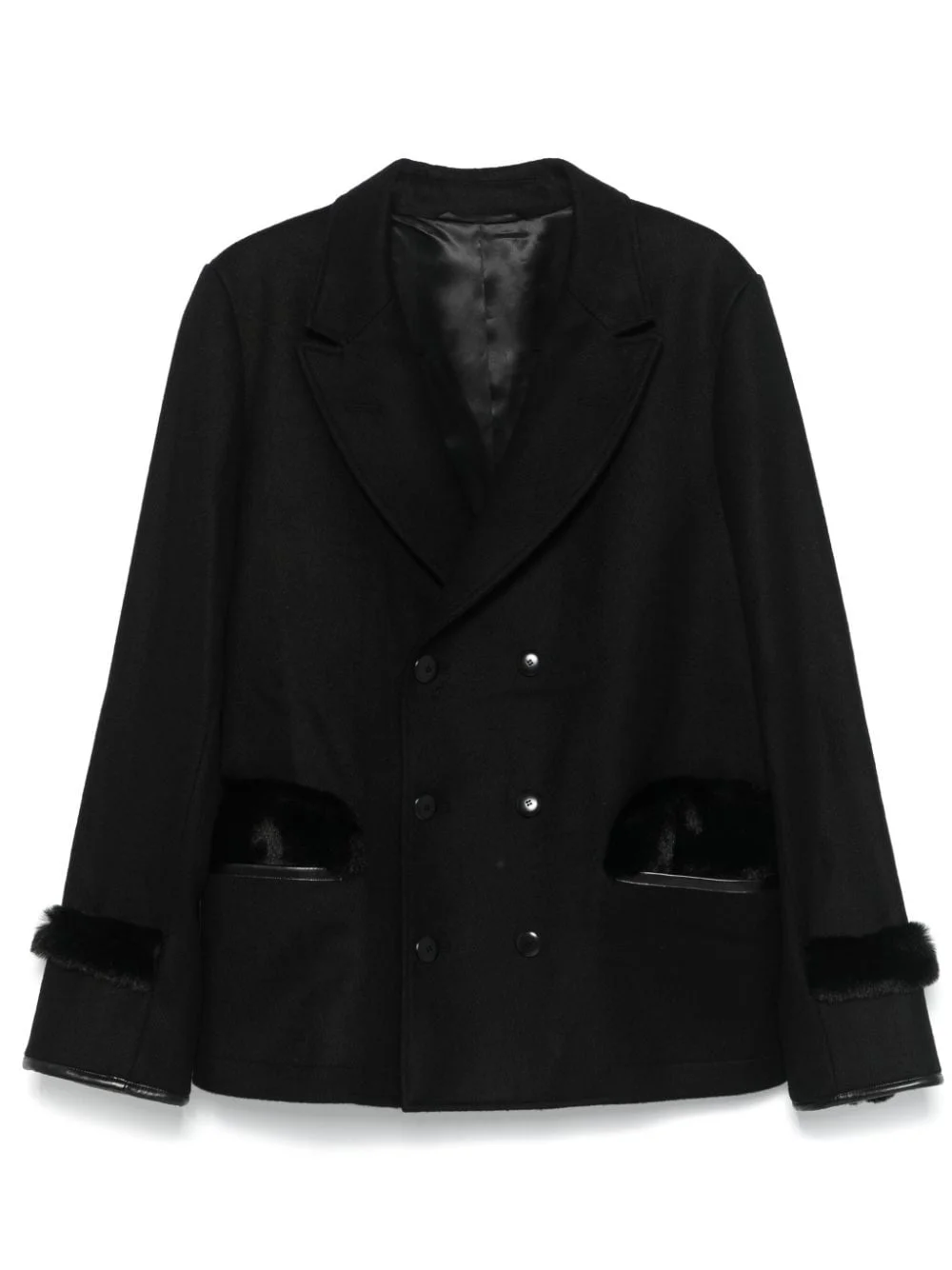 double-breasted jacket Highlights - Black - Wool blend - Non-brushed fleece - Double-breasted button fastening - Peak lapels - Long sleeves - Faux-fur detail cuffs - Two front jetted pockets - English rear vents - Full lining - Straight hem Imported Composition Outer: Polyester 100%, Wool 80%, Polyamide 20% Lining: Acetate 63%, Viscose 37% SIZE & FIT Model measurements Height 6 ft 2 in(1.88 m) Bust/Chest 36.61 in(93 cm) Hips 35.82 in(91 cm) Waist 27.95 in(71 cm) FittingInformation Designed for a regular fit, allowing for a comfortably loose fit throughout the body Made from a midweight non-stretch fabric