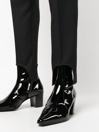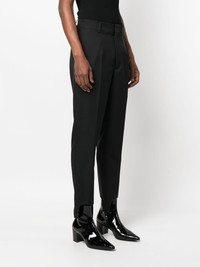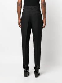 tapered stirrup trousers Highlights - Black - Pleat detailing - Belt loops - Concealed front fastening - Tapered leg - Two rear welt pockets - Stirrup cuffs Imported Composition Polyester 100% SIZE & FIT Model measurements Height 6 ft 2 in(1.88 m) Bust/Chest 35.03 in(89 cm) Hips 35.82 in(91 cm) Waist 27.95 in(71 cm) FittingInformation Designed for a slim fit, offering a comfortable fit that sits just away from the leg Made from a midweight non-stretch fabric This piece fits true to size – take your usual size