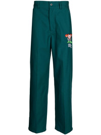 logo-embroidered straight-leg trousers Highlights - Teal green - Cotton blend - Embroidered logo at the leg - Embroidered motif - Pressed crease - Straight leg - Belt loops - Front button and zip fastening - Two side inset pockets - Two rear welt pockets Imported Composition Cotton 60%, Polyester 40%