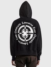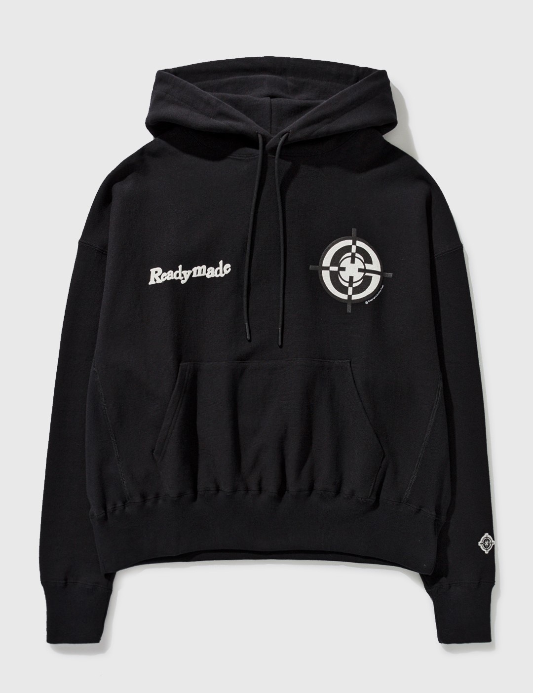 - READYMADE - CLF Target Hoodie - Drawstring hood with embroidered branding - Ribbed cuffs and hem - Drop shoulder - Kangaroo pocket - Flocked text at front and rear - Printed target graphic on chest and at rear - Straight hem - Color: Black - Material: 100% Cotton - See more Hoodies and Clothing SIZING - Model wears size M - Model measures: Height 190cm, Chest 34”/84cm, Waist 28”/70cm, Hip 35”/90cm