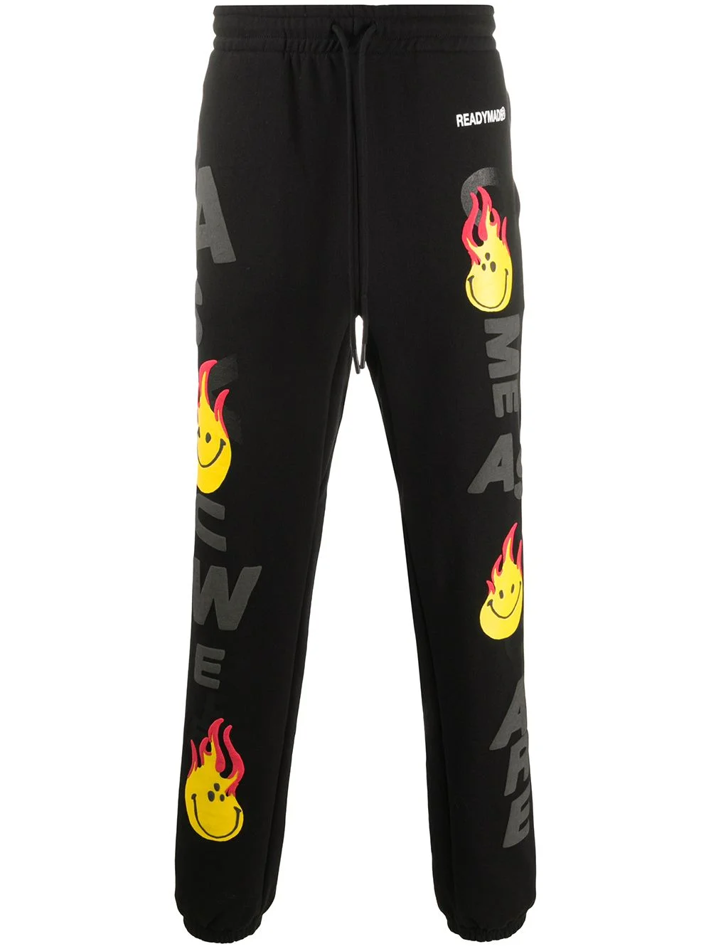 Awesome-printed track pants Black cotton Awesome-printed track pants from Readymade featuring a slogan detail, a color blocked design, an elasticated drawstring waist, side pockets, a rear pocket and elasticated cuffs. Imported Composition Cotton 100% SIZE & FIT Model measurements Height 6 ft 2 in(1.89 m) Bust/Chest 36.22 in(92 cm) Hips 37.79 in(96 cm) Waist 29.52 in(75 cm) FittingInformation This piece fits true to size. We recommend you get your regular size Designed to be loose over the leg with a fitted waist and hem Made with a mid-weight fabric Washing instructions Machine Wash