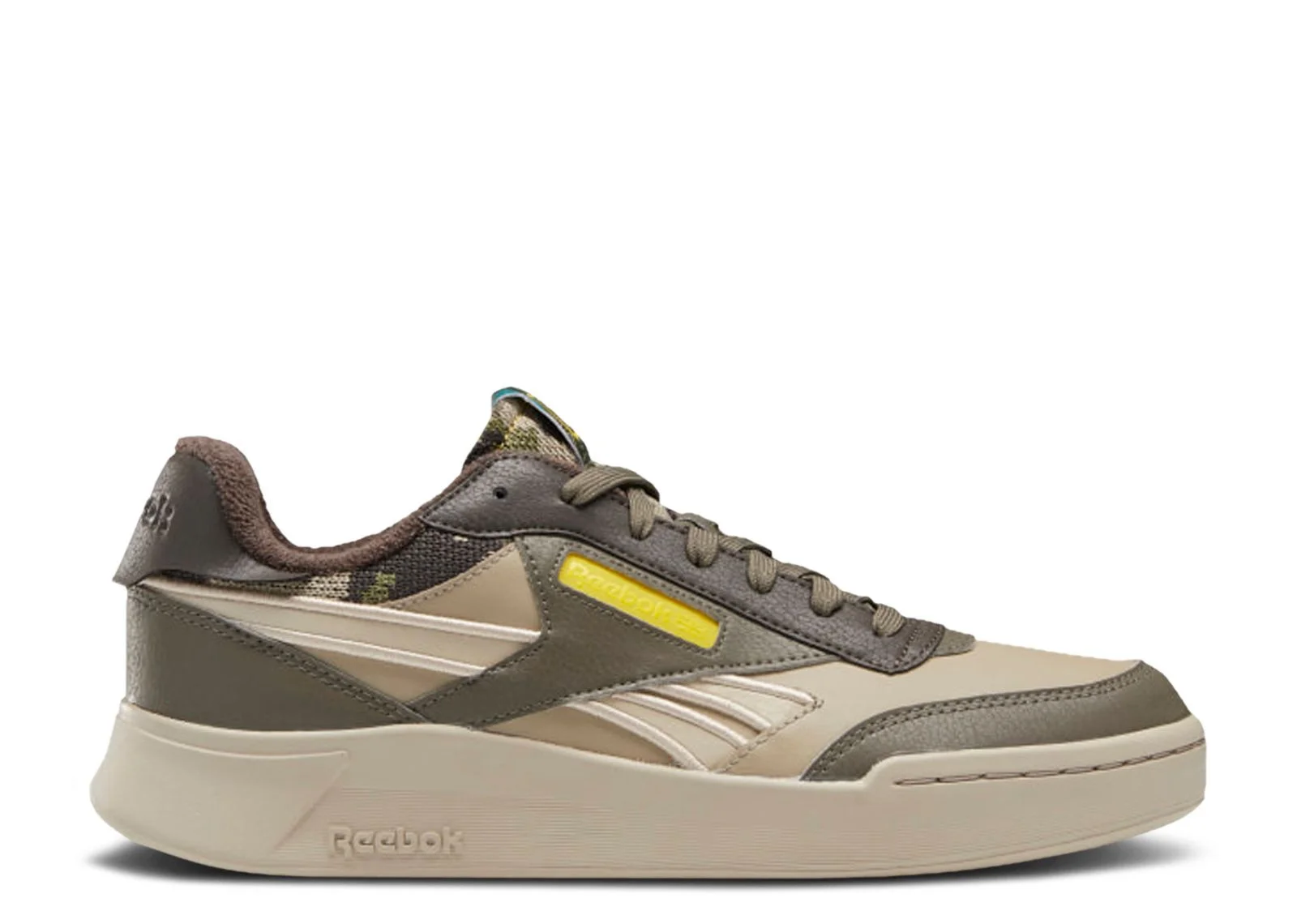 The National Geographic x Reebok Club C Revenge Legacy ‘The Lost World of Maya’ layers beige and brown leather on the upper, accented with a camo-print knit along the tongue and collar. The Reebok logo embellishes a bright yellow logo window, while the insoles have a graphic depicting the Lost World of the Maya. These sneakers ride on a tan rubber cupsole with a drop-in foam unit for a plush feel. SKU: GY1201 Colorway: Super Neutral/Terrain Grey/Stone Release Date: 9/16/21