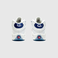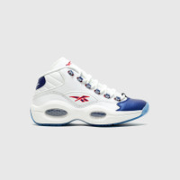 - GX0227 - FtwWht/ClaCob/Clear - Originally released in 1996, Reebok brings back Allen Iverson's Question Mid "Blue Toe", commemorating his iconic rookie season crossover - Full-grain leather upper - Lace closure - Embroidered branding - Pearlized blue toe and upper heel - Signature #3 embroidered heel detail - Special edition insole - Hexagonal cushioning - Ice blue rubber outsole